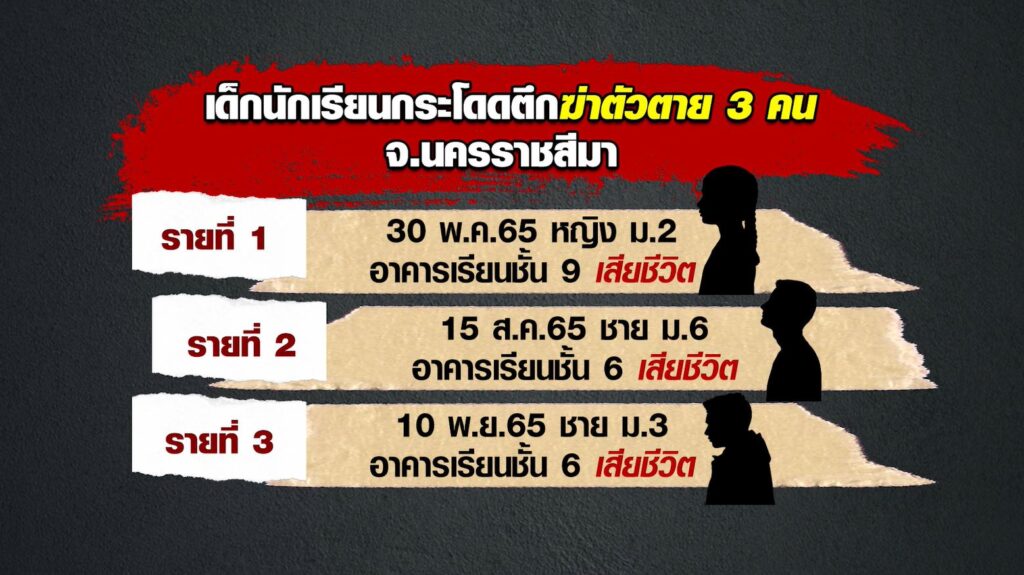 ปี 2565 มีเหตุเด็กนักเรียนชั้นมัธยมศึกษาชื่อดังในจังหวัดนครราชสีมา กระโดดอาคารเรียนเสียชีวิตมาแล้ว 3 ราย รายแรก เมื่อวันที่ 30 พฤษภาคม นักเรียนหญิง ม.2 กระโดดจากอาคารเรียนชั้น 9 เสียชีวิต รายที่ 2 เมื่อวันที่ 15 สิงหาคม นักเรียนชายชั้น ม.6 กระโดดอาคารเรียนชั้น 6 เสียชีวิต และรายล่าสุด นักเรียนชาย ม.3 กระโดดอาคารเรียนชั้น 6 เสียชีวิต