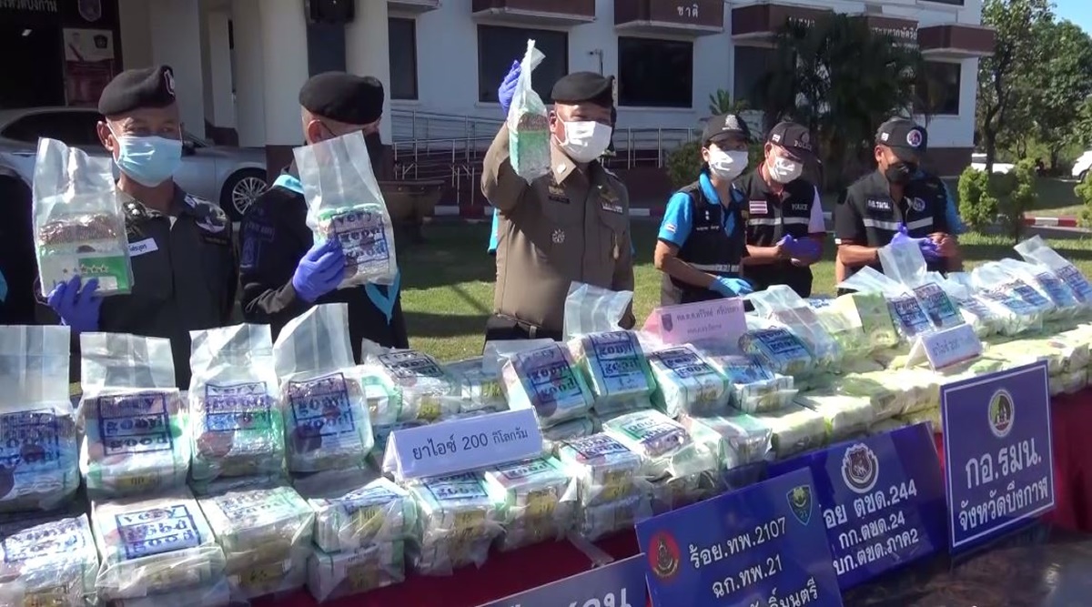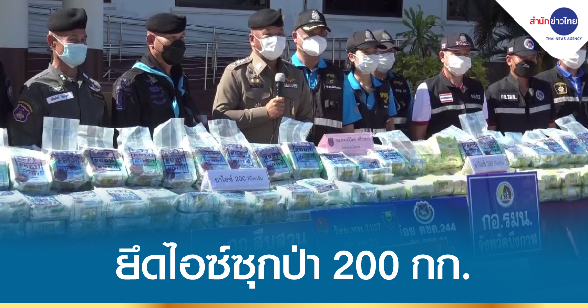 ตำรวจและทหาร จ.บึงกาฬ ร่วมกันแถลงผลการตรวจยึดยาไอซ์ บรรจุอยู่ในกระสอบห่อหุ้มด้วยถุงพลาสติกสีดำ จำนวน 5 กระสอบ กระสอบละ 40 ห่อ ห่อละประมาณ 1 กิโลกรัม รวมทั้งหมด 200 กิโลกรัม มูลค่ากว่า 6 ล้านบาท โดยตำรวจชุดสืบสวนได้รับแจ้งจากสายลับว่าจะมีการลักลอบขนยาเสพติด ในพื้นที่บ้านสมพร หมู่ 8 ต.โคกกว้าง อ.บุ่งคล้า จ.บึงกาฬ เมื่อไปถึงพบกระสอบสีดำต้องสงสัย วางอยู่ในสวนป่ายูคาลิปตัส ตรวจสอบพบเป็นยาไอซ์จำนวนมาก จึงให้ตำรวจพิสูจน์หลักฐาน จ.บึงกาฬ ตรวจหา DNA ที่ติดอยู่กับถุงดำที่ซุกซ่อนยาไอซ์ และนำของกลางมาตรวจสอบสารเสพติด ที่ สภ.บุ่งคล้า เร่งสืบสวนหาตัวผู้กระทำความผิดมาดำเนินคดีตามกฎหมายต่อไป. – สำนักข่าวไทย
