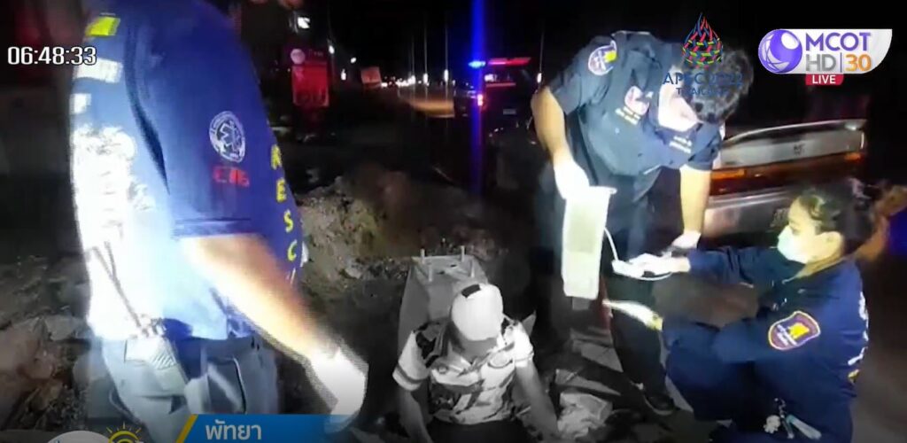 ที่เกิดเหตุพบนายไพทูรย์ เจ้าหน้าที่กู้ภัยกำลังช่วยปฐมพยาบาลบริเวณศีรษะมีเลือดไหล ใกล้กันพบรถยนต์เก๋งสีเทา สภาพยางล้อหน้า และหลังด้านซ้ายแตกทั้ง 2 เส้น