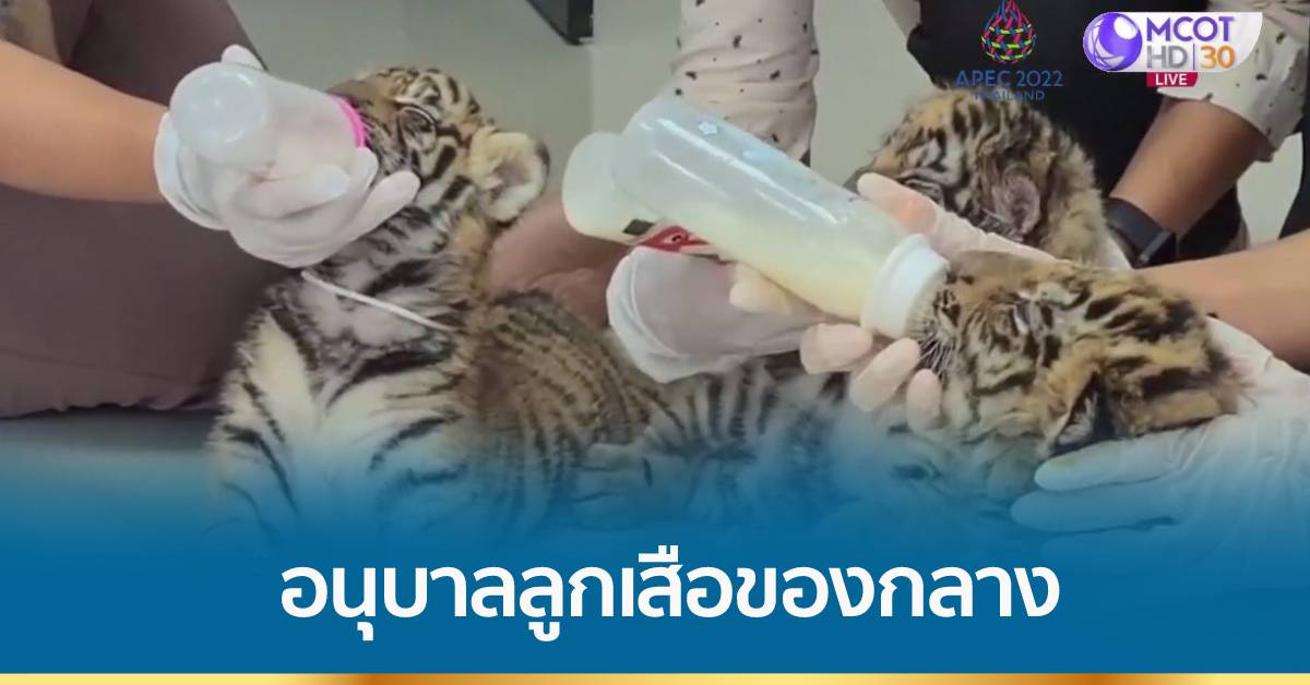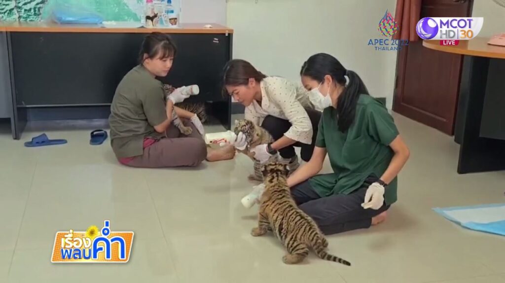 น.ส.คชรินทร์ ราชสินธุ์ นายสัตวแพทย์ปฏิบัติการประจำคลินิก กล่าวว่า จากการดูพฤติกรรมของลูกเสือทั้ง 4 ตัว คาดเป็นเสือเลี้ยง เพราะคุ้นกับคนและขี้อ้อน จึงตั้งชื่อให้ลูกเสือทั้ง 4 ตัว ว่า หุง อุ่น ตุ๋น ต้ม และช่วงนี้ยังให้นมที่ใช้สำหรับเลี้ยงลูกแมวเป็นอาหารทุกๆ 3 ชั่วโมง เพราะเป็นอาหารในกลุ่มเดียวกัน เพื่อให้ลูกเสือฟื้นตัวแข็งแรงเร็วขึ้น เมื่อลูกเสือหย่านมและกินเนื้อได้ ก็จะย้ายไปอยู่สถานีเพาะเลี้ยงสัตว์ป่าจุฬาภรณ์ อ.ขุขันธ์ จ.ศรีสะเกษ