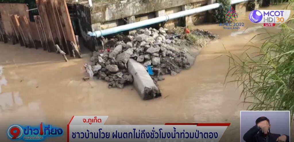 ภูเก็ต 18 พ.ย. – ชาวป่าตองโวย ฝนตกไม่ถึงชั่วโมง น้ำท่วมเกือบทั้งเมืองภูเก็ต ทำทรัพย์สินเสียหายหลายแสนบาท เชื่อผลพวงจากการปักแผ่นเหล็กในคลอง ขวางการไหลของน้ำ ส่วนหนึ่งของโครงการป้องกันระบบน้ำท่วมป่าตอง