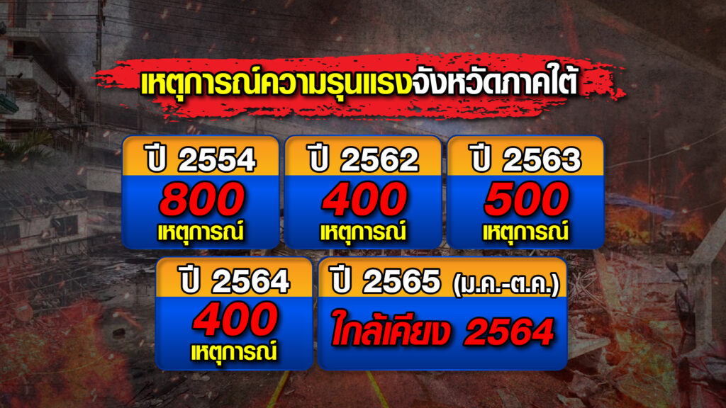 ด้าน ผศ.ดร.ศรีสมภพ จิตภิรมย์ศรี ผู้อำนวยการศูนย์เฝ้าระวังสถานการณ์ภาคใต้ และอาจารย์นักวิจัยสถานวิจัยความขัดแย้งและความหลากหลายทางวัฒนธรรมภาคใต้ มหาวิทยาลัยสงขลานครินทร์ วิทยาเขตปัตตานี เปิดเผยว่า เหตุการณ์ความรุนแรงในปีนี้มีแนวโน้มรุนแรงมากขึ้น โดยปี 2564 มีเหตุการณ์เกิดขึ้นทั้งปี ราว 400 เหตุการณ์ แต่ในปีนี้ตั้งแต่เดือนมกราคมถึงตุลาคม มีเหตุการณ์เกิดขึ้นใกล้เคียงกับปีที่ผ่านมา โดยยังไม่รวมเหตุการณ์ที่เกิดขึ้นในเดือนพฤศจิกยน และธันวาคม