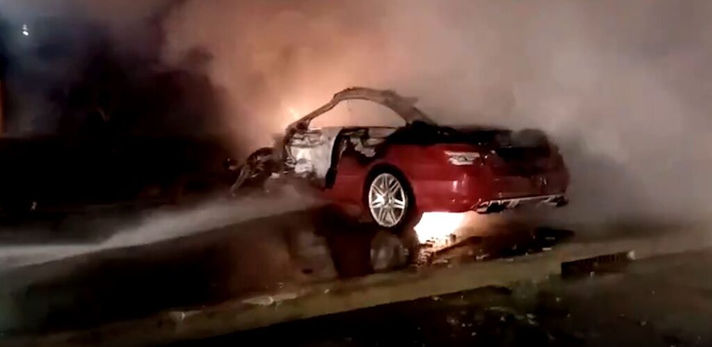 ตรวจสอบพบว่า รถคันดังกล่าวเสียหลักพุ่งขึ้นทางเท้า ชนร้านค้าริมทางพังเสียหาย รถหมุนไปชนเสาไฟส่องโค่น 1 ต้น และท้ายรถบัสรับส่งพนักงานโรงงานที่จอดอยู่ริมถนนพังเสียหาย จนรถเบนซ์เกิดไฟไหม้ เบื้องต้นตำรวจสันนิษฐานว่าคนขับน่าจะขับมาด้วยความเร็ว ประกอบกับมีฝนตกลงมาอย่างหนัก ทำให้ลื่นไถลไปชนกับร้านค้าและรถที่จอดริมทาง. – สำนักข่าวไทย