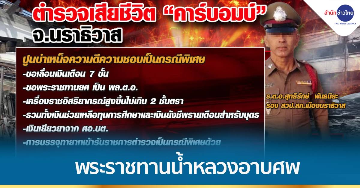 ที่วัดบางนรา ต.บางนาค อ.เมืองนราธิวาส ครอบครัว ร.ต.อ.สุทธิรักษ์ พันธนิยะ รองสารวัตรป้องกันปราบปรามสถานีตำรวจภูธรเมืองนราธิวาส ซึ่งเสียชีวิตจากเหตุคาร์บอมบ์ภายในแฟลตข้าราชการตำรวจ เมื่อวันที่ 22 พ.ย.ที่ผ่านมา ร่วมกับหน่วยงานที่เกี่ยวข้อง ได้ร่วมกันจัดเตรียมสถานที่เพื่อจัดพิธีรดน้ำศพ และพิธีพระราชทานน้ำหลวงอาบศพ พิธีวางพวงมาลาพระราชทานของพระบาทสมเด็จพระเจ้าอยู่หัว และพวงมาลาของพระบรมวงศานุวงศ์ ที่จะเชิญมาวางหน้าหีบศพในเวลา 14.00 น. วันนี้ โดย พล.อ.ไพบูลย์ คุ้มฉายา องคมนตรี
