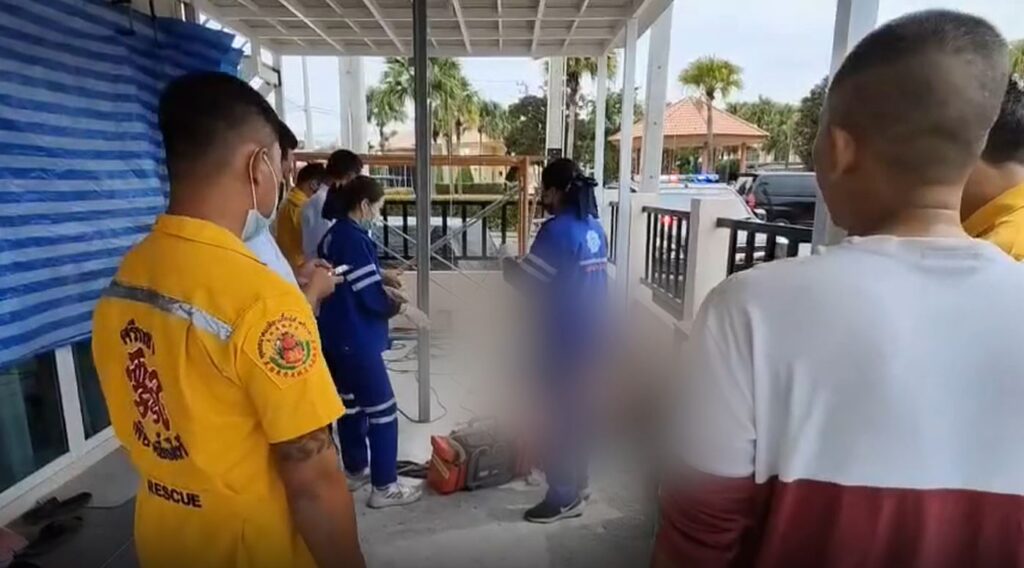 รถพยาบาลกู้ชีพและเจ้าหน้าที่ตำรวจเข้าตรวจสอบที่เกิดเหตุในหมู่บ้านแห่งหนึ่ง พื้นที่ หมู่ 3 ต.บึง อ.ศรีราชา จ.ชลบุรี เจ้าหน้าที่กู้ภัยได้ CPR นายปรีชา อายุ 46 ปี ชาวนครสวรรค์ ซึ่งเป็นช่างรับเหมาต่อเติมบ้าน หลังได้รับบาดเจ็บถูกใบหินเจียรที่เป็นไฟเบอร์หักแล้วกระเด็นใส่บริเวณกลางหน้าอก เป็นแผลลึกขนาดใหญ่เลือดไหลลองเต็มพื้น หมดสติ