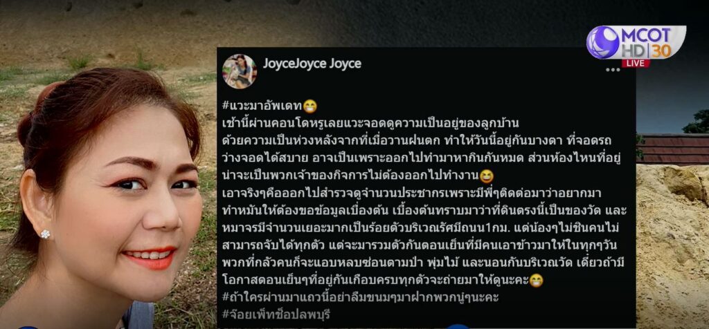 วันนี้คุณ joyce Joyce joyce โพสต์อีกครั้งว่า “แวะมาอัปเดต เช้านี้ผ่านคอนโดฯ หรูเลยแวะจอดดูความเป็นอยู่ของลูกบ้าน ด้วยความเป็นห่วงหลังจากที่เมื่อวานฝนตก ทำให้วันนี้อยู่กันบางตา ที่จอดรถว่าง จอดได้สบาย อาจเป็นเพราะออกไปทำมาหากินกันหมด ส่วนห้องไหนที่อยู่น่าจะเป็นพวกเจ้าของกิจการ ไม่ต้องออกไปทำงาน ครั้งนี้ตั้งใจมาสำรวจจำนวน เพราะมีพี่ๆ ติดต่อมาว่าอยากมาทำหมันให้ เบื้องต้นทราบมาว่าเป็นที่ดินของวัด มีสุนัขจรจัดเป็นร้อยตัวบริเวณรัศมี 1 กม. มักมารวมตัวกันตอนเย็นที่มีคนเอาข้าวมาให้ และไม่ได้เชื่องทุกตัว