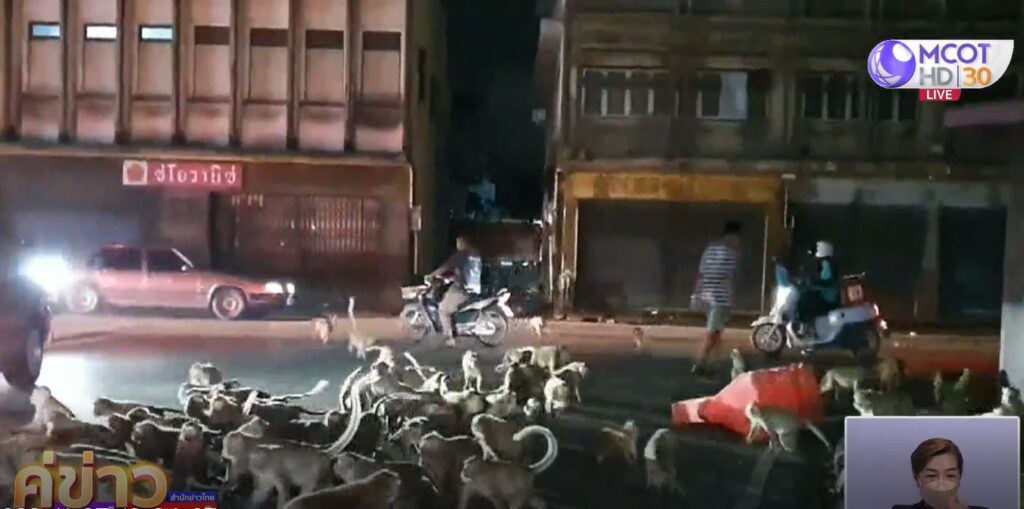 ลพบุรี 27 พ.ย. – ลิงลพบุรีตกใจตื่นกลัวเสียงพลุ ตะไล ดังสนั่นกลางเมือง วิ่งลงถนนหนีตายอลหม่าน ไม่สนใจรถวิ่งไปมา คนใช้รถใช้ถนนต้องหยุดรถตัวโก่ง