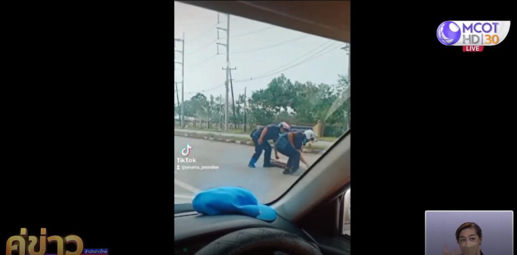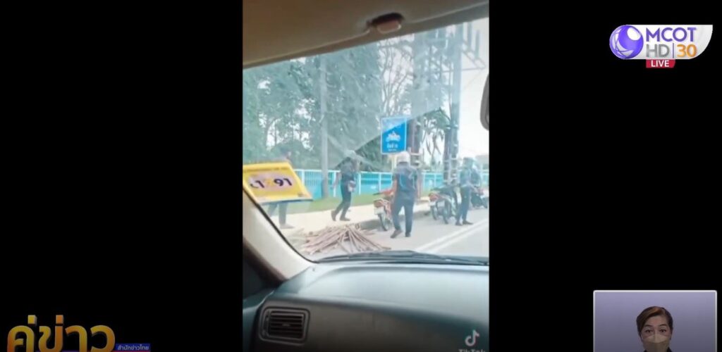 ผู้ใช้ tiktok ชื่อ @onuma_peandee โพสต์คลิปเด็กช่างกลช่วยกันเก็บต้นอ้อยที่รถกระบะทำร่วงบริเวณสามแยกทางเข้าสนามบินตรัง ถนนสายตรัง-ปะเหลียน ต.โคกหล่อ อ.เมือง จ.ตรัง