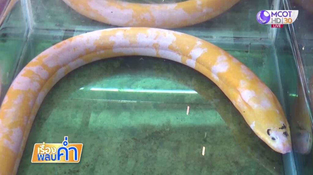 ชาวบ้านหมู่ 7 ต.แม่ใส อ.เมือง จ.พะเยา เดินทางไปที่บ้านของนายทวง กัมติ เพื่อดูปลาไหลสุดแปลก มีสีสันไม่เหมือนปลาไหลทั่วไป มี 2 สี ทั้งสีเหลืองทองอร่าม และสีขาวสลับกันทั่วลำตัว ที่สำคัญมีตามีคิ้วดูน่ารัก