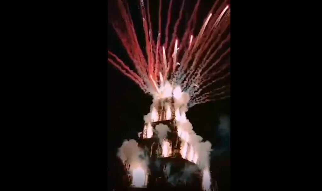 ส่วนพลุที่มีขนาดใหญ่ด้านบน พบว่าเป็นการจุดที่ด้านนอกองค์เจดีย์ เพียงแต่มุมกล้องที่ถ่ายทำให้เหมือนภาพซ้อนว่าจุดจากองค์เจดีย์ ซึ่งผลจากการตรวจไม่พบร่องรอยความเสียหายของตัวองค์พระธาตุเจดีย์ และพลุที่จุดก็ไม่ได้ติดตั้งแบบถาวร แต่เป็นการนำไปห้อยไว้ตามจุดต่างๆ ของตัวองค์พระธาตุเจดีย์ และเศษชิ้นส่วนที่พบเห็นเหมือนว่าแตกจากองค์เจดีย์ออกมา ตรวจสอบแล้วพบเป็นเศษชิ้นส่วนเก่าที่เคยหลุดลอกออกมาก่อนหน้านี้แล้ว เพราะตัวองค์พระธาตุเคยบูรณะมาก่อน ยังมีเศษตกหล่นอยู่บริเวณโดยรอบอยู่บ้าง