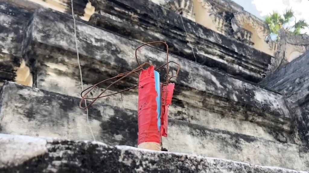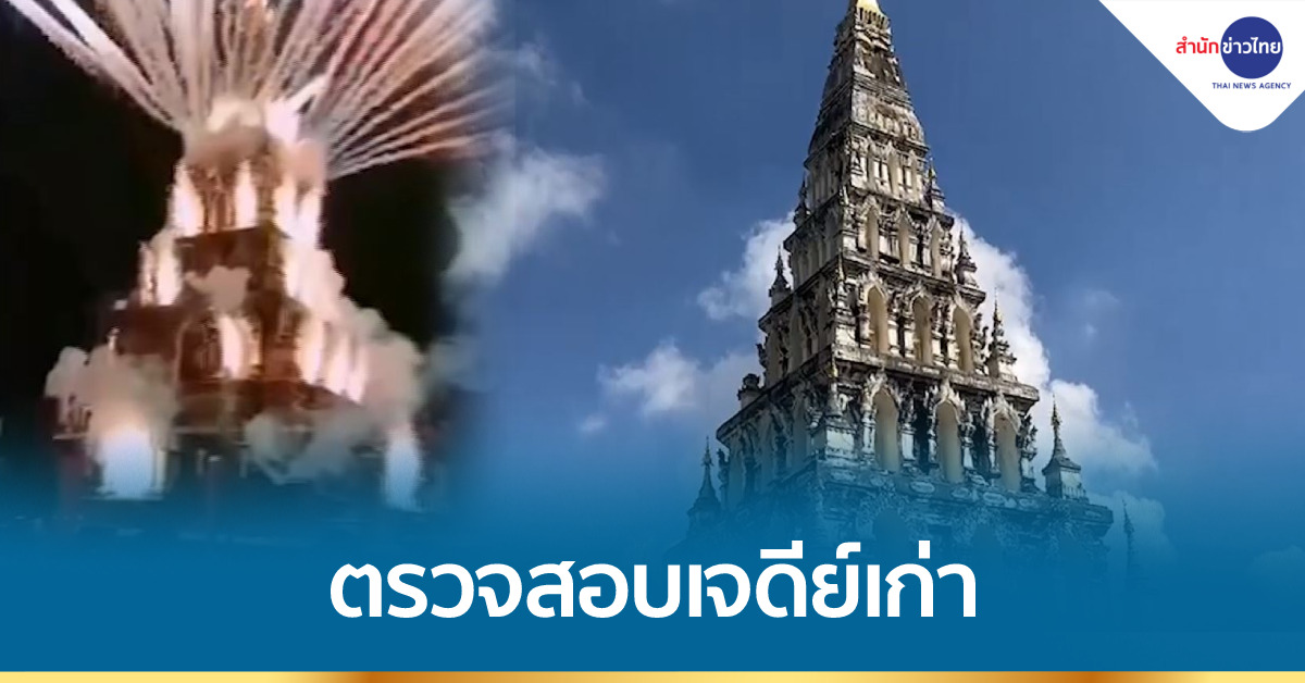 นายเทอดศักดิ์ เย็นจุระ ผู้อำนวยการกลุ่มอนุรักษ์โบราณสถาน สำนักศิลปากรที่ 7 เชียงใหม่ เดินทางมาตรวจสอบและเข้าพบเจ้าอาวาสวัด โดยระบุว่าจากการตรวจสอบโดยรอบพบว่าเป็นพลุหรือภาคเหนือเรียกว่า “บอกไฟดอก” เป็นพลุที่ถูกนำมาห้อยโยงกัน เมื่อมีการจุดจะไปตามสายชนวนและจุดตามแต่ละชั้นที่วางไว้ มองจากคลิปที่ปรากฏพบว่าใช้เวลาไม่ถึง 1 นาที ก็ดับหมดแล้ว