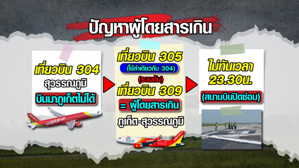 นายมนต์ชัย ตะโหนด ผู้อำนวยการท่าอากาศยานภูเก็ต ชี้แจงว่า สาเหตุเริ่มจากเที่ยวบินขาเข้าของเวียตเจ็ท เที่ยวบินที่ VZ2304 ที่มาจากท่าอากาศยานสุวรรณภูมิ–ภูเก็ต ไม่สามารถบินมาที่ภูเก็ตได้ ทำให้ทางสายการบินต้องบริหารจัดการนำผู้โดยสารที่จะเดินทางออกจากภูเก็ตไปกรุงเทพ ในเที่ยวบิน VZ2305 ไปรวมกับเที่ยวบินที่ VZ309 (เพราะเที่ยวบิน VZ2305 ต้องรอเครื่องที่มาจากกรุงเทพ) ต่อมาเมื่อเที่ยวบินที่ VZ309 ได้นำอากาศยานออกจากหลุมจอดและเข้าทางวิ่ง ปรากฏว่าได้ประสานหอบังคับการบินภูเก็ต เพื่อขอกลับเข้าหลุมจอดอีกครั้ง โดยแจ้งสาเหตุว่ามีปัญหาผู้โดยสารมีจำนวนเกินขีดความสามารถของอากาศยาน คือ เกินมา 1 คน ทำให้ต้องเสียเวลาเคลียร์ปัญหา จนทำให้ล่าช้า ไม่สามารถนำอากาศยานทำการบินได้ก่อนเวลาปิดทางวิ่ง เพราะทางสนามบินภูเก็ตประกาศปิดใช้งานทางวิ่ง ช่วงเวลา 23.30-07.30 น. เพื่อการบำรุงรักษาทางวิ่ง-ทางขับ จึงเป็นสาเหตุทำให้ผู้โดยสารตกค้างทั้งหมดกว่า 300 คน โดยหลังเกิดเหตุ สายการบินดังกล่าวได้นำผู้โดยสารไปยังที่พัก และได้นำผู้โดยสารทั้งหมดเดินทางในช่วงเช้าวันนี้ (2 ธ.ค.) .-สำนักข่าวไทย