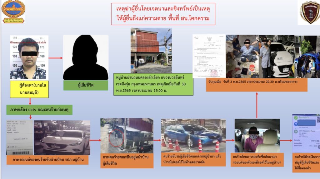 ตำรวจสืบสวน สน.โคกคราม ร่วมกับ ตำรวจ สภ.บางบัวทอง จ.นนทบุรี แถลงจับกุม นายโย (นามสมมุติ) อายุ 28 ปี ผู้ต้องหาก่อเหตุฆ่าชิงทรัพย์หญิง อายุประมาณ 50 ปี ภายในหมู่บ้านหรู ย่านนวลจันทร์ เมื่อช่วงบ่ายของวันที่ 30 พฤศจิกายน ที่ผ่านมา โดยตำรวจจับกุมได้ที่บ้านพักของผู้ต้องหาย่านบางบัวทอง และสามารถยึดของกลางทรัพย์สิน ได้เป็น รถยนต์ 1 คัน, สร้อยคอทองคำ น้ำหนัก 10 บาท 1 เส้น, สร้อยข้อมือ น้ำหนัก 5 บาท, ทองตำแผ่น 1 สลึง, โทรศัพท์มือถือ และไอแพด