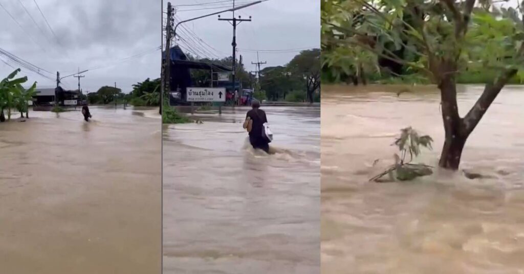 ขณะที่ จ.นครศรีธรรมราช ก็มีน้ำท่วมหนัก บ้านสวนพริก หมู่ที่ 13 ต.ท่าศาลา แม้ระดับจะท่วมแค่เข่า แต่น้ำไหลเชี่ยว คนที่เดินฝ่ากระแสน้ำ แทบต้านไม่ไหว . – สำนักข่าวไทย