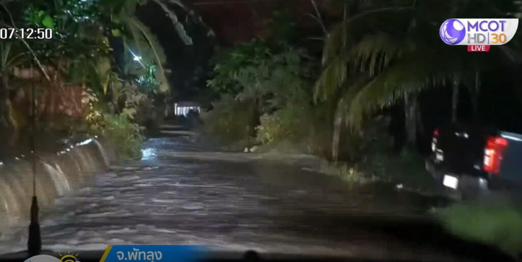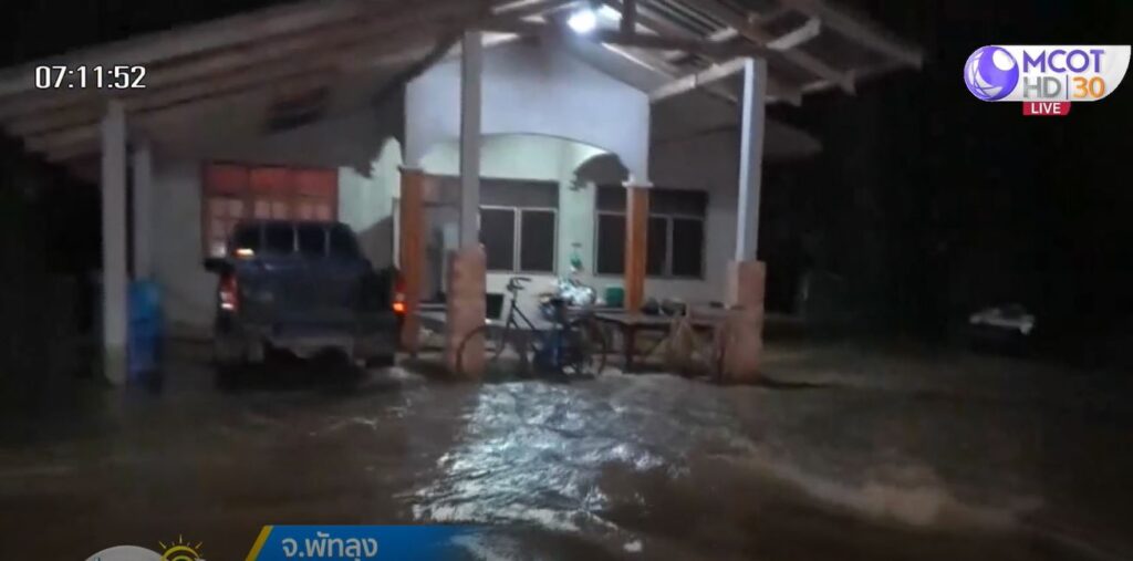 กระแสน้ำที่ไหลเชี่ยวหลากท่วมบ้านเรือนหลายจุดใน จ.พัทลุง โดยเฉพาะพื้นที่ลุ่ม ต.ชะรัด อ.กงหรา ต.นาโหนด ต.ปรางหมู่ ต.โคกชะงาย อ.เมือง และ ต.ควนขนุน ต.ปันแต ต.มะกอกเหนือ อ.ควนขนุน หลังเกิดฝนตกต่อเนื่อง โดยเฉพาะพื้นที่เขตรักษาพันธุ์สัตว์ป่าเขาบรรทัด และพื้นที่อุทยานแห่งชาติเขาปู่ เขาย่า อ.กงหรา อ.ป่าบอน อ.ตะโหมด อ.ศรีนครินทร์ อ.ศรีบรรพต และ อ.ป่าพะยอม โดยมวลน้ำฝนที่ตกสะสมบวกกับน้ำป่าที่ไหลหลากลงมาตามน้ำตกต่างๆ ไหลลงลำคลอง ทำให้ปริมาณน้ำเพิ่มสูงขึ้นและเอ่อล้นหลากท่วมบ้านเรือนประชาชน