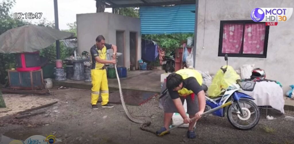 ขณะที่กูภัยมูลนิธิใต้เต็กตึ้งนครศรีธรรมราช ช่วยกันจับงูเหลือมยาวประมาณ 2 เมตร แอบกินไก่ชนราคานับหมื่นบาทของนายไตรรัตน์ อายุ 36 ปี ชาว ต.ปากพูน อ.เมือง ซึ่งขังไว้ในเล้า โดยกู้ภัยพยายามใช้บ่วงคล้องคองูเหลือม ทำให้งูเหลือมตกใจ ก่อนขย่อนไก่ออกจากปาก แล้วพยายามเลื้อยหนี แต่ติดอยู่ในเล้าไก่ ในที่สุดกู้ภัยก็จับได้ ก่อนนำไปปล่อย