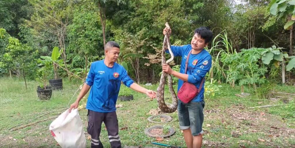 จากนั้นเจ้าหน้าที่กู้ภัยฯ เข้าไปที่เกิดเหตุ พบงูเหลือม ซึ่งตัวไม่ใหญ่มากนัก นอนขดตัวนิ่งอยู่มุมของกรงไก่ เนื่องจากเขมือบไก่ไข่เข้าไปแล้วถึง 5 ตัว จนท้องป่อง ยังไม่สามารถจะเลื้อยไปไหนได้ไหว ซึ่งภายในกรงไก่ยังพบไก่ที่ถูกงูเหลือมรัดจนกระดูกหักนอนนิ่งอยู่ภายในกรงอีก 1 ตัว และนำออกจากกรงไปรักษาอาการบาดเจ็บ จากนั้นเจ้าหน้าที่กู้ภัยฯ ใช้ผ้าแหย่ไปที่ตัวงู เพื่อให้งูตื่นตกใจ และพยายามจะเลื้อยหนีขึ้นทางช่องหลังคาเล้าไก่ กู้ภัยฯ จึงใช้มือเปล่าคว้าไปที่คองูได้สำเร็จ และนำออกจากกรงไก่ จากการตรวจสอบดูลำตัวงูพบว่างูได้เขมือบไก่ไปแล้วถึง 5 ตัว เจ้าหน้าที่จึงนำงูใส่ถุงปุ๋ยนำไปปล่อยคืนสู่ธรรมชาติต่อไป