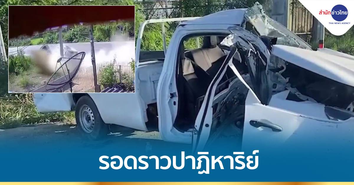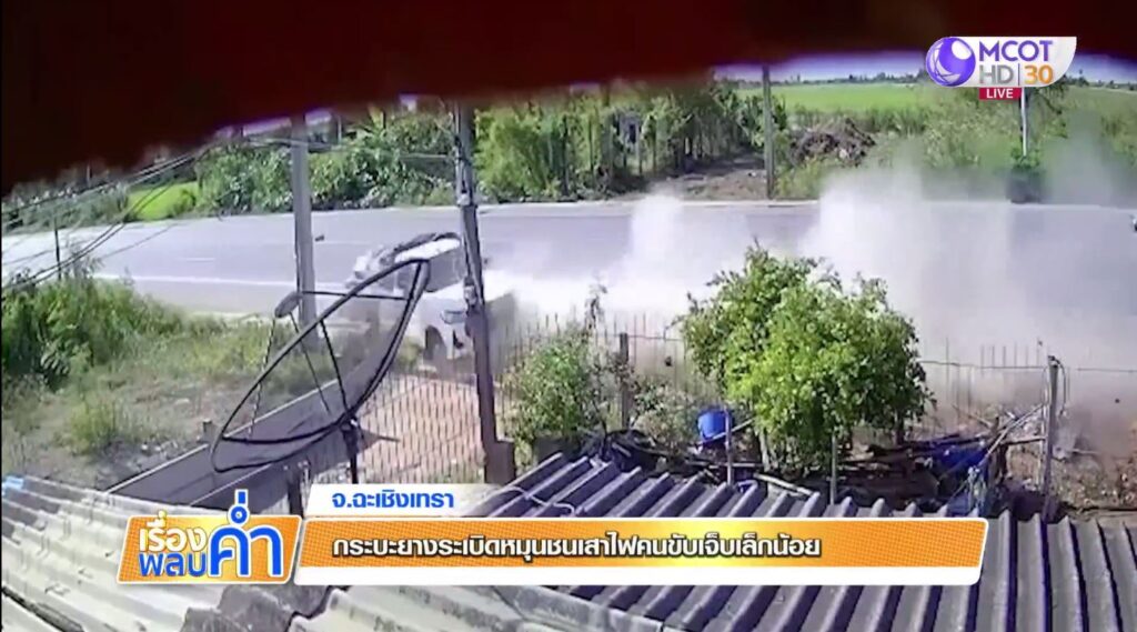 ภาพจากคลิปวงจรปิด ซึ่งเพจเรารักสุวินทวงศ์โพสต์ไว้ ระบุเหตุการณ์เกิดขึ้นบนถนน รพช. ซอยปองพล ม.8 ต.คลองเปรง อ.เมืองฉะเชิงเทรา จับภาพนาทีที่รถกระบะบรรทุกของมาเต็มคัน เสียหลักพุ่งชนเข้ากับเสาไฟส่องสว่างข้างทาง