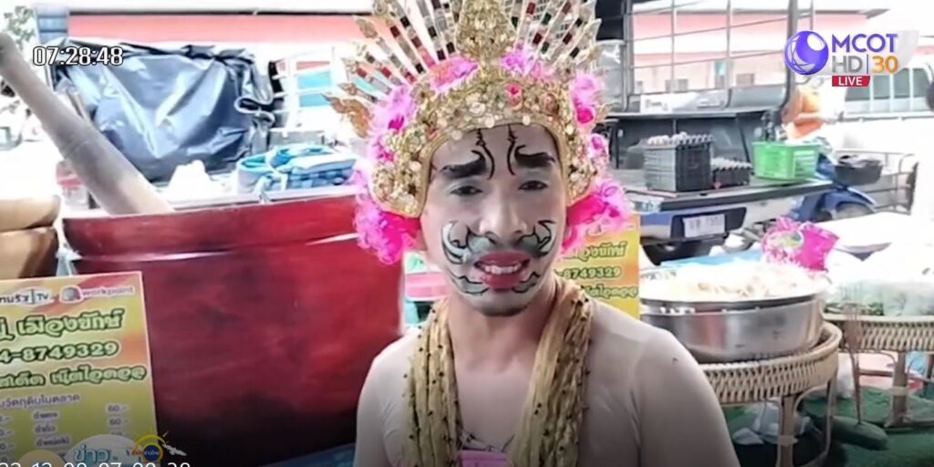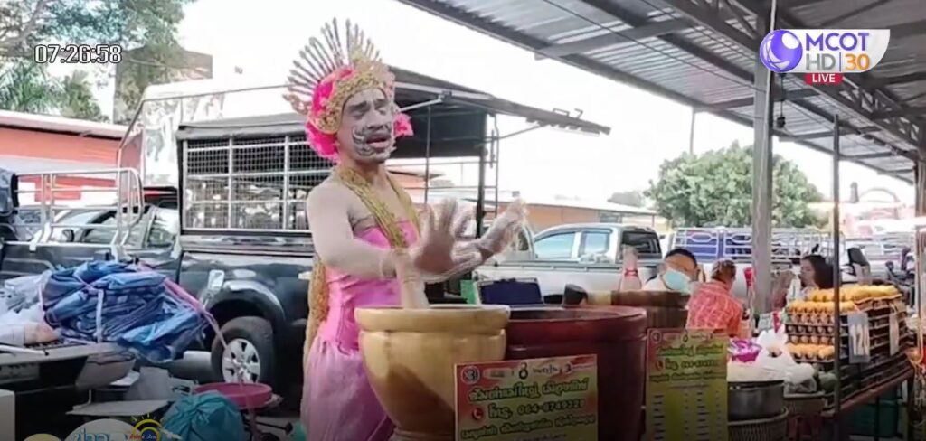 ปราจีนบุรี 8 ธ.ค. – หนุ่มลิเกตกงาน ผันตัวเองเป็นพ่อค้าขายส้มตำตามตลาดนัด แต่งชุดนางยักษ์ ร้องลิเกเรียกลูกค้า สร้างรายได้สุดปังวันละ 10,000-12,000 บาท
