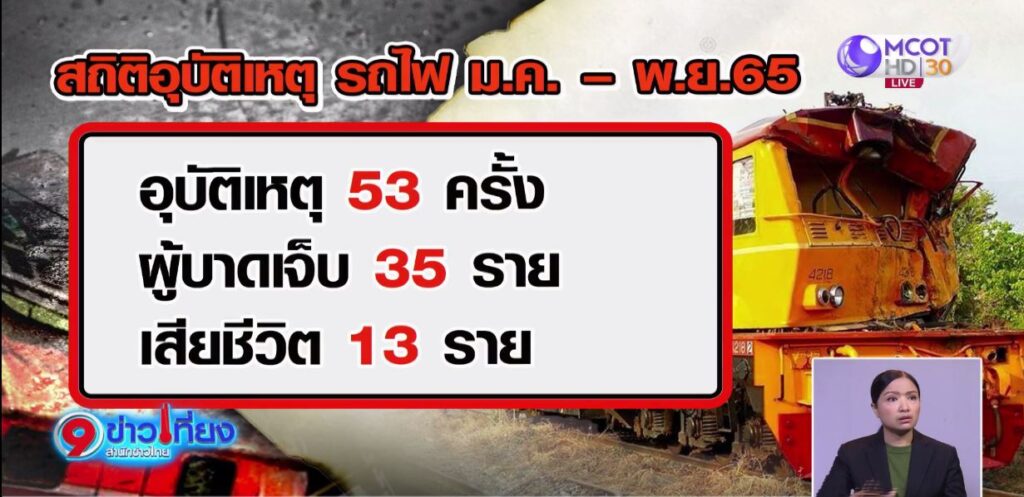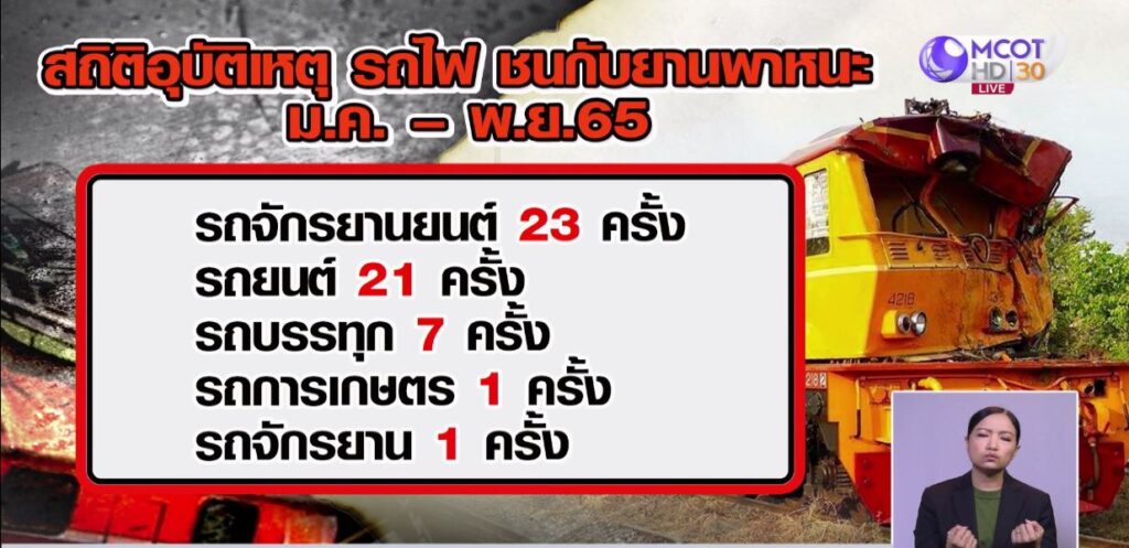 ข้อมูลสถิติอุบติเหตุรถไฟชนกับยานพาหนะ ในปี 65 (ม.ค. – พ.ย.65) เกิดอุบัติเหตุทั้งหมด 53 ครั้ง มีผู้บาดเจ็บรวม 35 ราย และเสียชีวิต 13 ราย ในจำนวนแบ่งออกเป็นอุบัติเหตุ ระหว่างสถานี 47 ครั้ง(เจ็บ 31 ตาย 12) และในบริเวณย่านสถานี 6 ครั้ง (เจ็บ 4 ตาย1) ยานพาหนะที่เกิดเหตุเยอะที่สุด คือ รถจักรยานยนต์ 23 ครั้ง รถยนต์ 21 ครั้ง รถบรรทุก 7 รถการเกษตร 1 รถจักรยาน 1 และจุดที่มักเกิดอุบัติเหตุบ่อยที่สุด คือ ทางลักผ่าน 26 ครั้ง /จุดที่มีเครื่องกั้น 25 ครั้ง