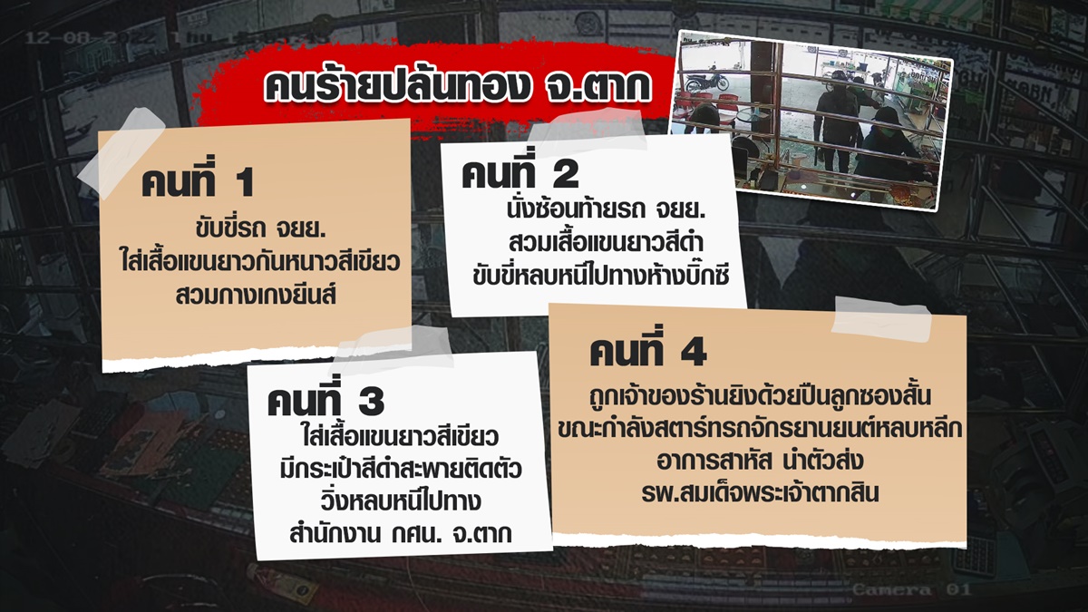 คนร้ายขับขี่รถจักรยานยนต์ไม่ทราบสี ยี่ห้อ หมายเลขทะเบียนรถ โดยคนร้ายจำนวน 4 คน คนที่ 1 ขี่รถจักรยานยนต์ ใส่เสื้อแขนยาวกันหนาวสีเขียว สวมกางเกงยีนส์ คนที่ 2 นั่งซ้อนท้ายรถจักรยานยนต์ สวมเสื้อแขนยาวสีดำ หลบหนีไปทางห้างบิ๊กซี คนที่ 3 ใส่เสื้อแขนยาวสีเขียว มีกระเป๋าสีดำสะพายติดตัว วิ่งหลบหนีไปทางสำนักงาน กศน. จังหวัตตาก และคนที่ 4 ถูกเจ้าของร้านยิงด้วยปืนลูกซอง ขณะกำลังสตาร์ทรถจักรยานยนต์หลบหนี อาการสาหัส เจ้าหน้าที่ต้องปฐมพยาบาลเบื้องต้น ก่อนนำตัวส่งโรงพยาบาลสมเด็จพระเจ้าตากสิน
