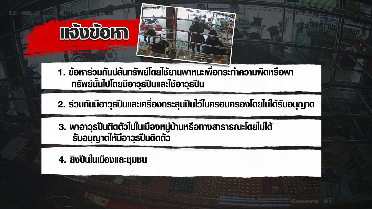 ตำรวจเตรียมแจ้งข้อหาร่วมกันปล้นทรัพย์โดยใช้ยานพาหนะเพื่อกระทำความผิดหรือพาทรัพย์นั้นไป โดยมีอาวุธปืนและใช้อาวุธปืน, ร่วมกันมีอาวุธปืนและเครื่องกระสุนปืนไว้ในครอบครองโดยไม่ได้รับอนุญาต, พาอาวุธปืนติดตัวไปในเมือง หมู่บ้าน หรือทางสาธารณะ โดยไม่ได้รับอนุญาตให้มีอาวุธปืนติดตัว, ยิงปืนในเมืองและชุมชน ซึ่งตำรวจจะรวบรวมพยานหลักฐานและติดตามตัวคนร้ายที่หลบหนีอีก 2 คน มาดำเนินคดีต่อไป. – สำนักข่าวไทย