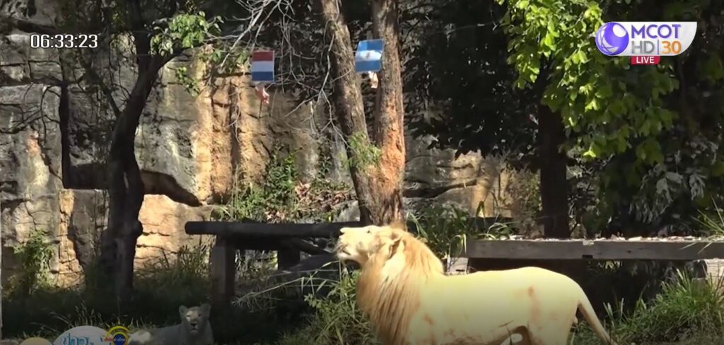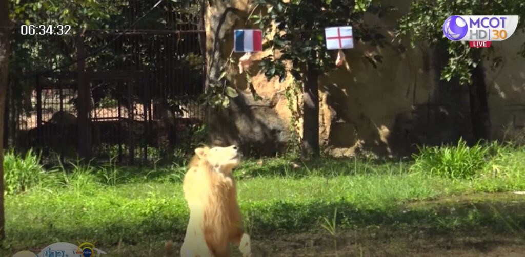 ขณะที่สวนสัตว์ขอนแก่น นำน่องไก่สดติดธงชาติคู่ฟุตบอลในรอบน็อกเอาท์ 8 ทีมสุดท้าย ติดกับลวดสลิงชักรอกลงมาให้ “เจ้าบอย” สิงโตขาว อายุ 9 ปี ทำนายผลด้วยการเลือกตะปบน่องไก่