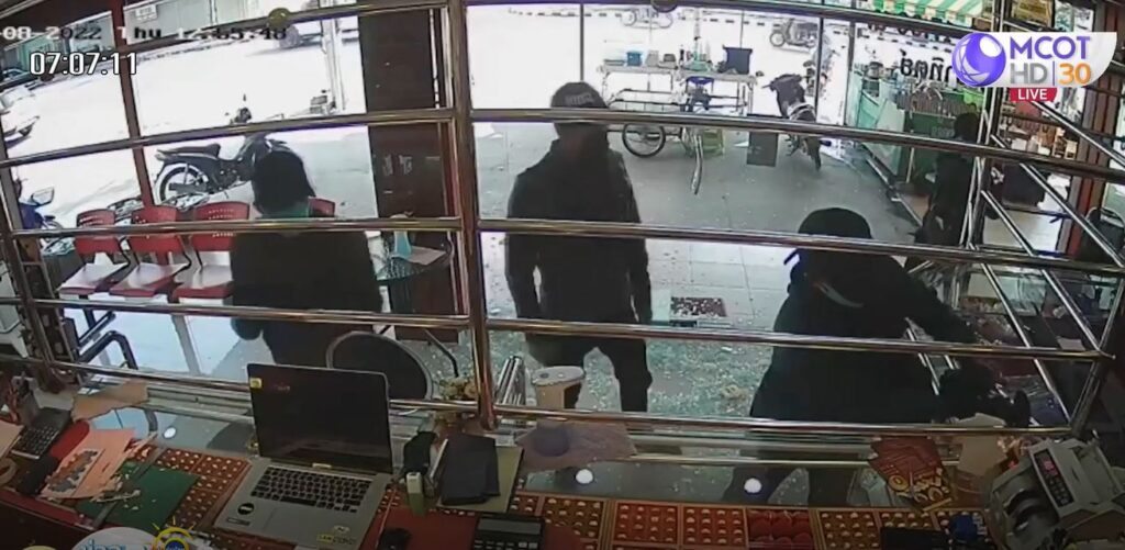 ภาพจากกล้องวงจรปิดเหตุปล้น “ร้านทองกรุงเทพ 4” ตั้งอยู่บนถนนดอนเจดีย์-วาเล่ย์ หมู่ 1 ต.พบพระ อ.พบพระ จ.ตาก ใกล้กับทางเข้าออกหน้าโรงพยาบาล อ.พบพระ ซึ่งเป็นย่านชุมชน เมื่อวันที่ 12 ก.พ.ที่ผ่านมา