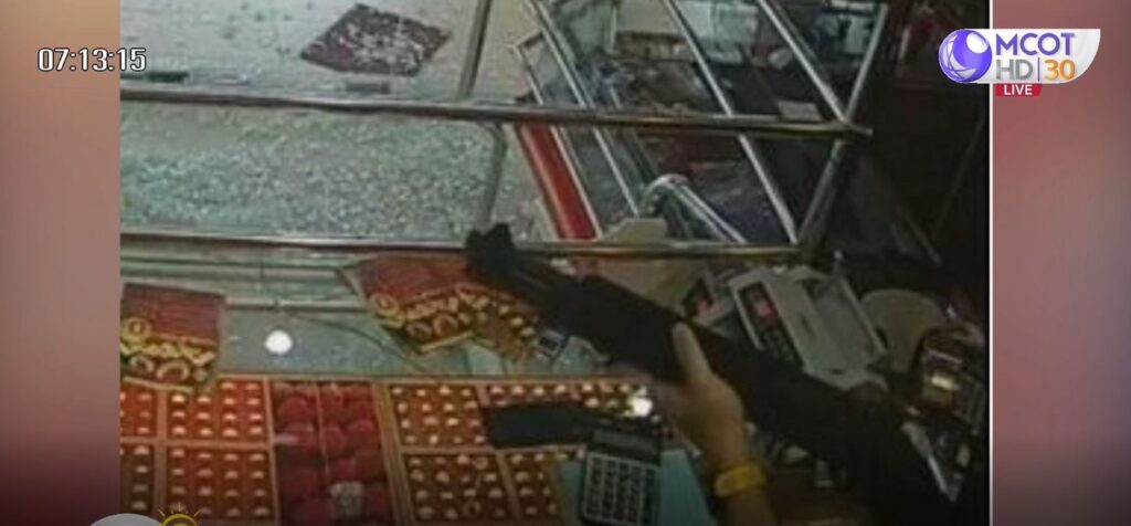 ภาพวงจรปิดบันทึกเหตุการณ์เห็นชัดเจนว่าคนร้าย 3 คน แต่งกายมิดชิด สวมหมวกกันน็อกแบบเต็มใบ ลงจากรถกระบะ ใช้ปืนพกสั้นไม่ทราบขนาด ยิงถล่มร้านทอง จากนั้นใช้ค้อนตรงเข้าไปทุบกระจก และวิ่งเข้าไปกวาดทองรูปพรรณใส่กระเป๋า ก่อนวิ่งกลับไปขึ้นรถกระบะ ขับมุ่งหน้าหลบหนีไปทางแนวชายแดนไทย-เมียนมา