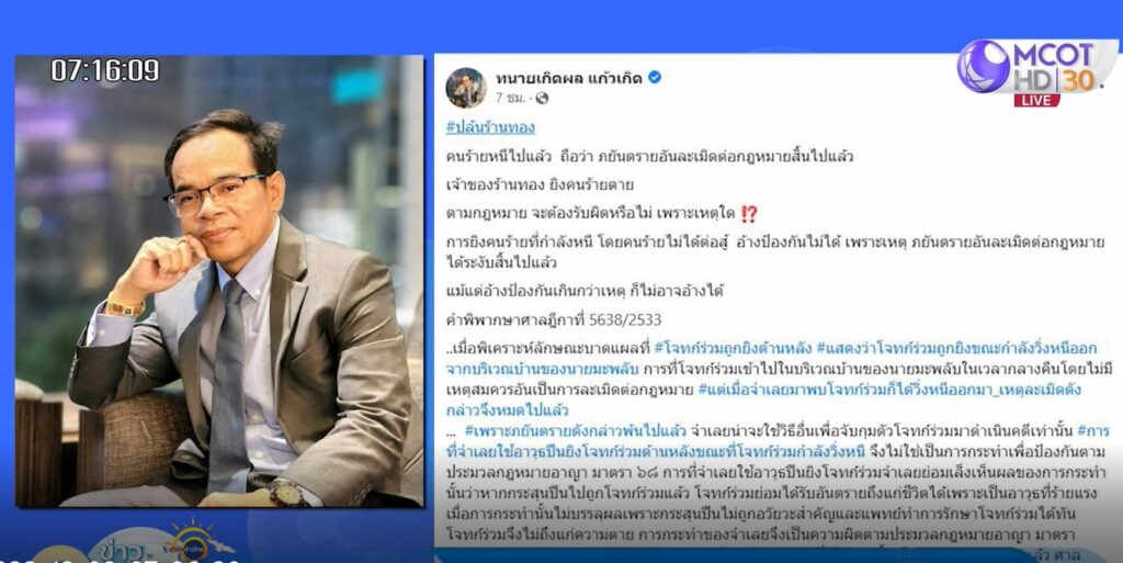ทนายเกิดผล แก้วเกิด ทนายความชื่อดัง ออกมาให้ความเห็นผ่านทางเฟซบุ๊ก ระบุว่า คนร้ายหนีไปแล้ว ถือว่าภยันตรายอันละเมิดต่อกฎหมายสิ้นไปแล้ว เจ้าของร้านทองยิงคนร้ายตาย ตามกฎหมายจะต้องรับผิดหรือไม่ เพราะเหตุใด