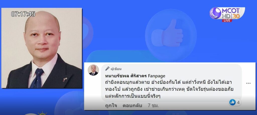 ภายหลังจากข้อความดังกล่าวถูกเผยแพร่ออกไป ปรากฏว่ามีคนเข้ามาแสดงความเห็นกันอย่างกว้างขวาง ได้ส่งภาพเหตุการณ์คนร้ายออกไปอยู่นอกร้านทอง แต่ได้ชักปืนเล็งเป้าเข้ามาภายในร้านทองอีกครั้ง ทำให้ทนายเกิดผลโพสต์ข้อความอีกครั้งระบุว่า “…ถ้ามีภาพชัดขนาดนี้ว่าคนร้ายบางคนใช้อาวุธยิงต่อสู้เจ้าของร้านทอง ก็ถือว่าภยันตรายอันละเมิดต่อกฎหมายยังมีอยู่ เจ้าของร้านยิงป้องกันได้ ไม่ผิดกฎหมาย ไม่เป็นการป้องกันเกินกว่าเหตุ คนร้ายตายฟรี” เช่นเดียวกับทนายรัชพล ศิริสาคร โพสต์ข้อความหลังจากได้ดูภาพเหตุการณ์ .-สำนักข่าวไทย