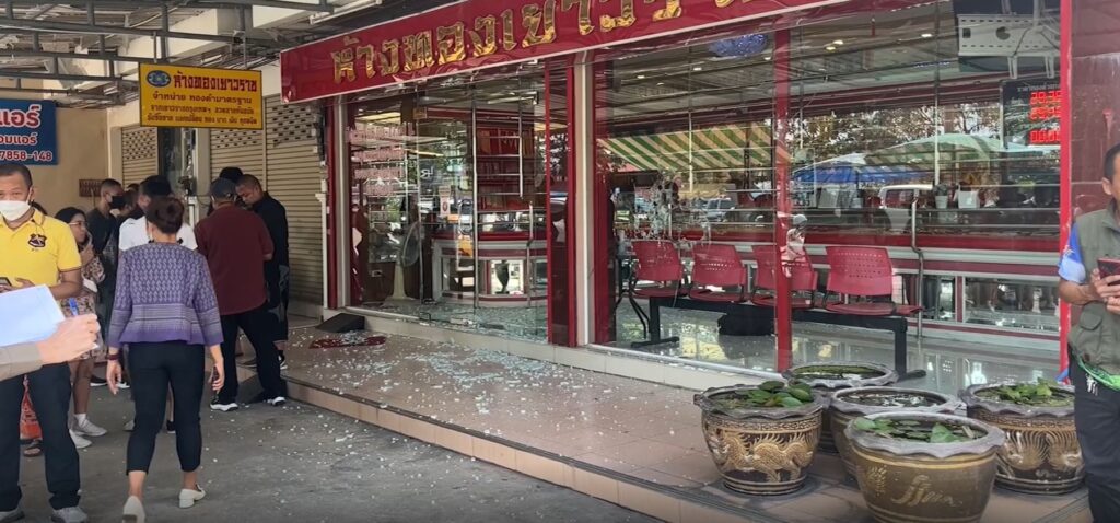 เหตุการณ์ระทึกขวัญกลางเมืองที่จังหวัดตาก เป็นห้างทองเยาวราช ภาพจากกล้องวงจรปิดเห็นคนร้าย 4 คน ขี่รถจักรยานยนต์มา 2 คัน ไม่ปิดป้ายทะเบียน ซ้อนมาคันละ 2 คน ใส่เสื้อแจ็กเก็ต สวมหน้ากากอนามัยและสวมหมวกปิดบังใบหน้า เดินเข้ามาหน้าร้านพร้อมปืนเก็บเสียงไม่ทราบขนาด ยิงกระจกแตกกระจาย ใช้เท้าถีบประตูเข้ามา