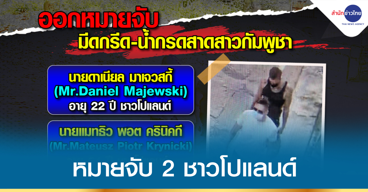 ชลบุรี 9 ธ.ค. – ตำรวจ สภ.บางละมุง ลั่นออกหมายจับ 2 คนร้ายชาวโปแลนด์แล้ว หลังก่อเหตุกรีดหน้า-ราดน้ำกรดศิลปินสาวกัมพูชา แต่คนร้ายหนีออกนอกประเทศไปก่อน พร้อมประสานอินเตอร์โพลออกหมายจับสากล