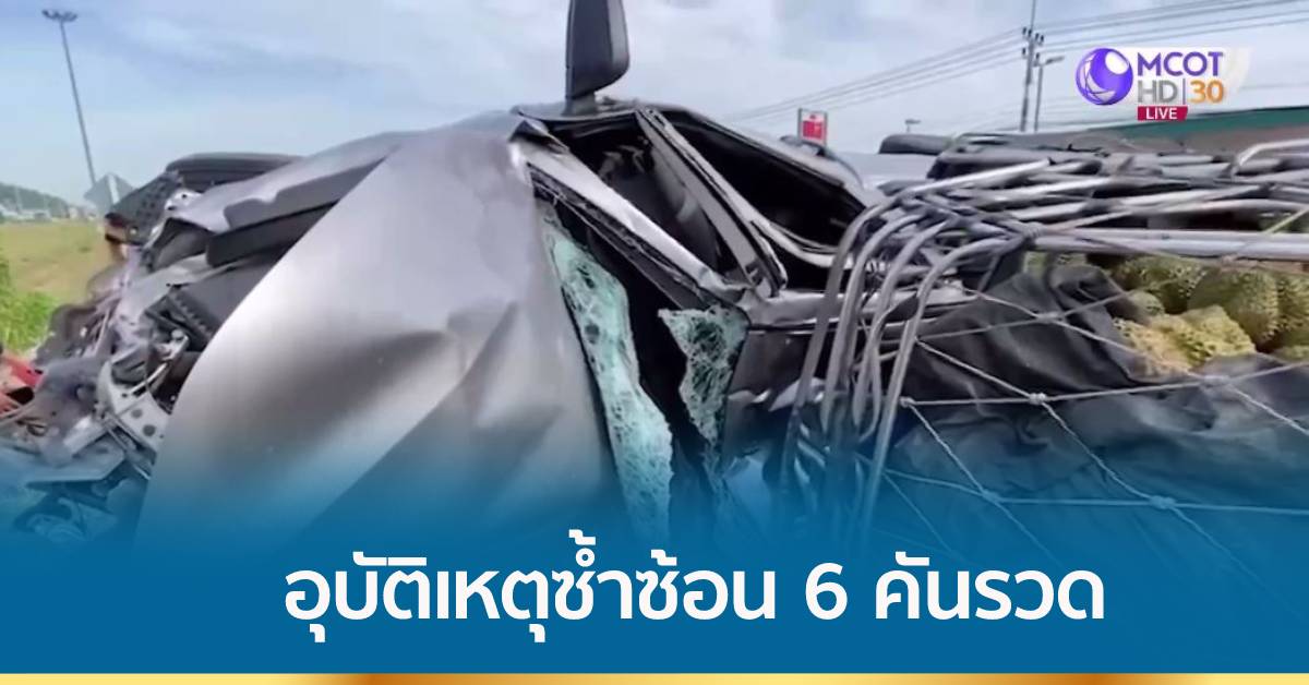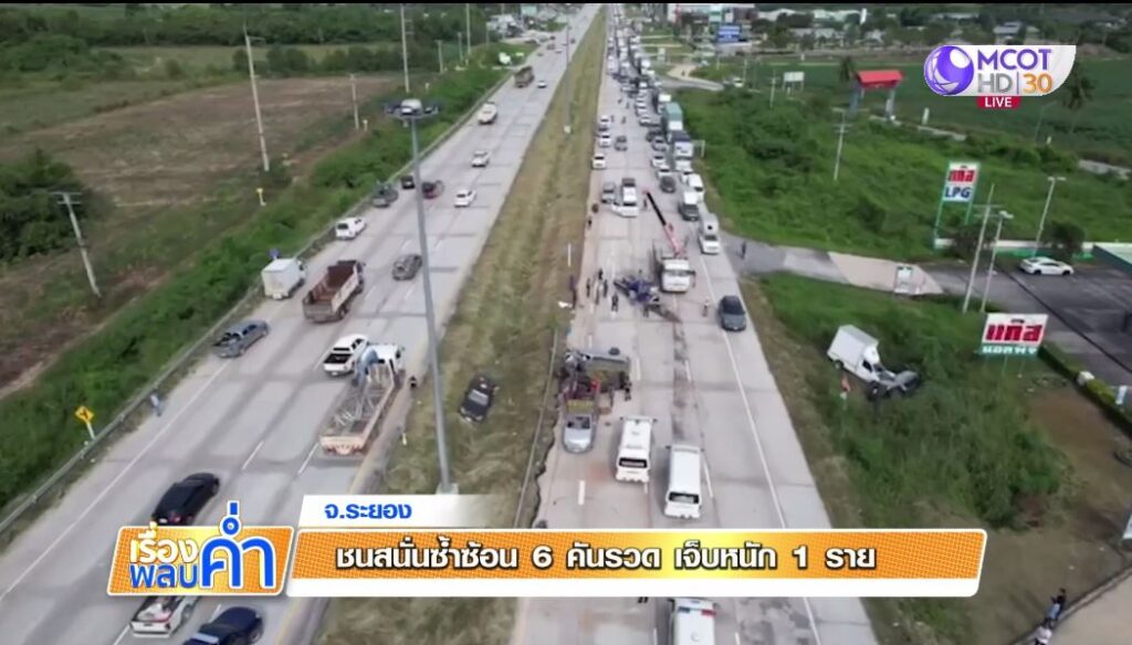ระยอง 9 ธ.ค. – ชน 6 คันซ้อน บนถนนสาย 36 ฝั่งขาเข้าเมืองระยอง หน้าตลาดมายอง ต.มะขามคู่ อ.นิคมพัฒนา จ.ระยอง บาดเจ็บ 1 คน ส่วนรถเทรลเลอร์ต้นเหตุขับหลบหนีไป