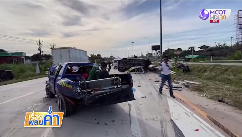 ส่วนรถกระบะที่ขับมาชนรถกระบะที่เปิดสัญญาณไฟกระเด็นไปกลางถนน เป็นจังหวะเดียวกันกับรถยนต์กระบะที่ขับมาทางตรงหลบไม่ทัน พุ่งชนรถกระบะอยู่กลางถนน จนรถทั้งสองคันกระเด็นตกร่องน้ำริมถนน จากการตรวจสอบพบว่ามีรถชนกันทั้งหมด 6 คัน ส่วนรถเทรลเลอร์ต้นเหตุขับหลบหนีไป