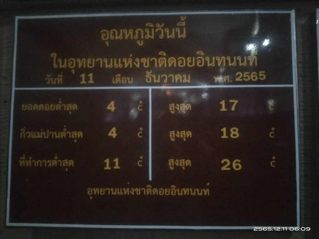 ดอยอินทนนท์ จ.เชียงใหม่ เช้านี้ (11 ธ.ค.) ทั้งบนยอดดอยและที่กิ่วแม่ปาน อุณหภูมิต่ำสุดอยู่ที่ 4 องศาเซลเซียส ซึ่งลดลงจากเมื่อวานนี้ถึง 5 องศาเซลเซียส ทำให้นักท่องเที่ยวจำนวนมากที่ขึ้นไปรอชมพระอาทิตย์ยามเช้าพร้อมท้าลมหนาวได้สัมผัสความเย็นยะเยือกกันสมใจ ท่ามกลางความสวยงามของแสงแรกในเช้าวันใหม่และมีทะเลหมอกผืนใหญ่เต็มตา นอกจากนี้นักท่องเที่ยวยังตื่นตาตื่นใจกับน้ำค้างแข็งขาวโพลนบริเวณข้างทางบนยอดดอย นับเป็นการเกิดน้ำค้างแข็งครั้งที่ 6 ของหน้าหนาวปีนี้ ซึ่งนักท่องเที่ยวไม่พลาดที่จะเก็บภาพความสวยงามไว้เป็นที่ระลึก