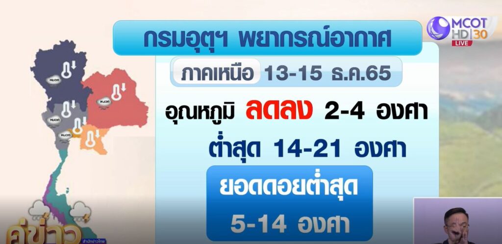 -ภาคเหนือ ระหว่างวันที่ 13-15 ธ.ค. 65 อุณหภูมิลดลง 2-4 องศาเซลเซียส ต่ำสุด 14.21 องศาเซลเซียส ยอดดอยต่ำสุด 5-14 องศาเซลเซียส