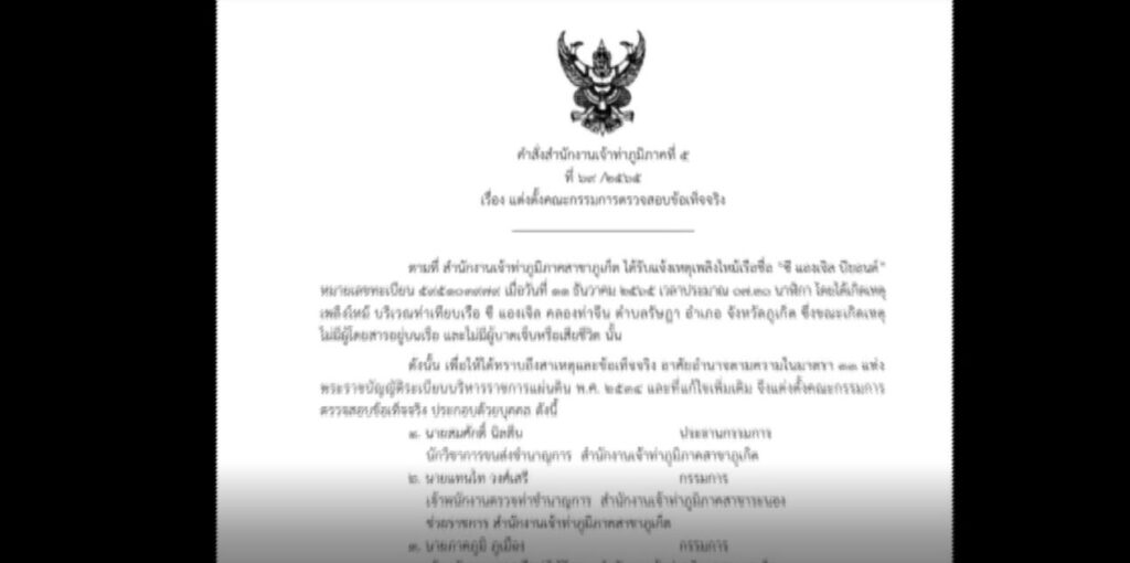 นายณชพงศ ประนิตย์ เจ้าท่าภูมิภาค สาขาภูเก็ต กล่าวว่า เพื่อให้ทราบถึงสาเหตุและข้อเท็จจริงที่เกิดขึ้น จึงมีคำสั่งสำนักงานเจ้าท่าภูมิภาคที่ 5 แต่งตั้งคณะกรรมการตรวจอบข้อเท็จจริง เพื่อสอบสวนหาสาเหตุและมาตรการป้องกัน เพื่อไม่ให้เกิดเหตุซ้ำ และมีอำนาจในการเชิญเจ้าหน้าที่ที่เกี่ยวข้องมาให้ถ้อยคำและเรียกพยานหลักฐานที่เกี่ยวข้องมาประกอบการตรวจสอบข้อเท็จจริงได้ตามเห็นสมควร อาทิ ผู้เห็นเหตุการณ์ เจ้าของเรือ โดยจะดำเนินการให้แล้วเสร็จภายใน 15 วัน พร้อมกันนี้ได้มีคำสั่งงดใช้เรือ และให้นำเรือขึ้นคาน เพื่อตรวจสอบ คาดว่าจะสามารถดำเนินการได้ภายใน 1-2 วัน เพื่อจะได้ดำเนินการตามขั้นตอนของกฎหมายต่อไป