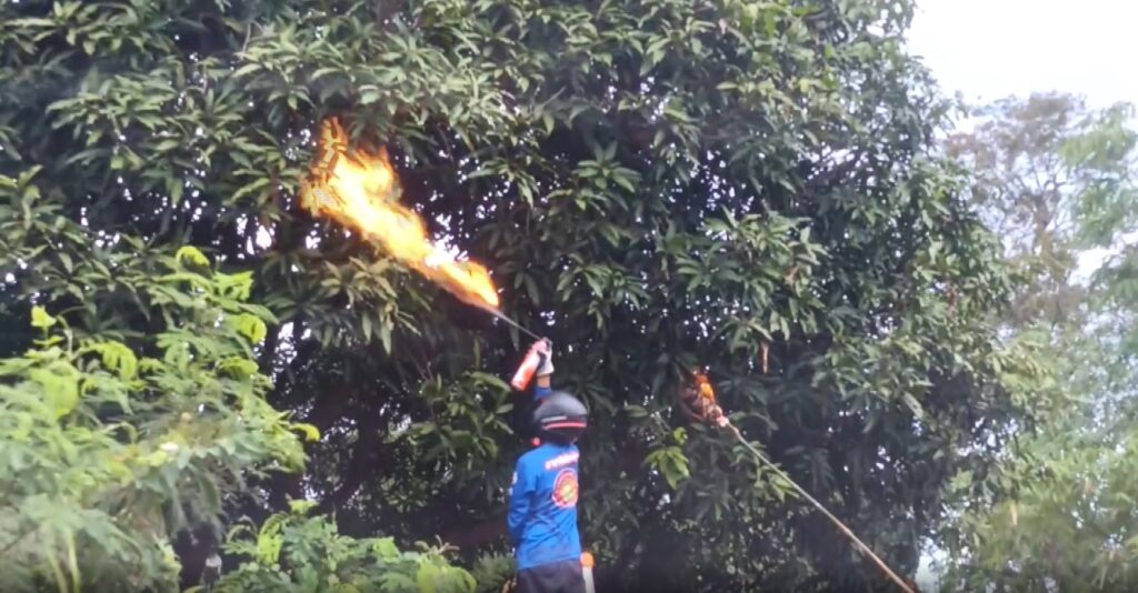ภูมิภาค 13 ธ.ค. – กู้ภัยใจกล้าไม่สวมชุดป้องกัน พ่นไฟกำจัดรังต่อหัวเสือ หลังชาวบ้าน ต.โคกสว่าง อ.เมือง จ.สระบุรี ร้องขอให้ช่วยกำจัด หลังมาทำรังที่กิ่งมะม่วง