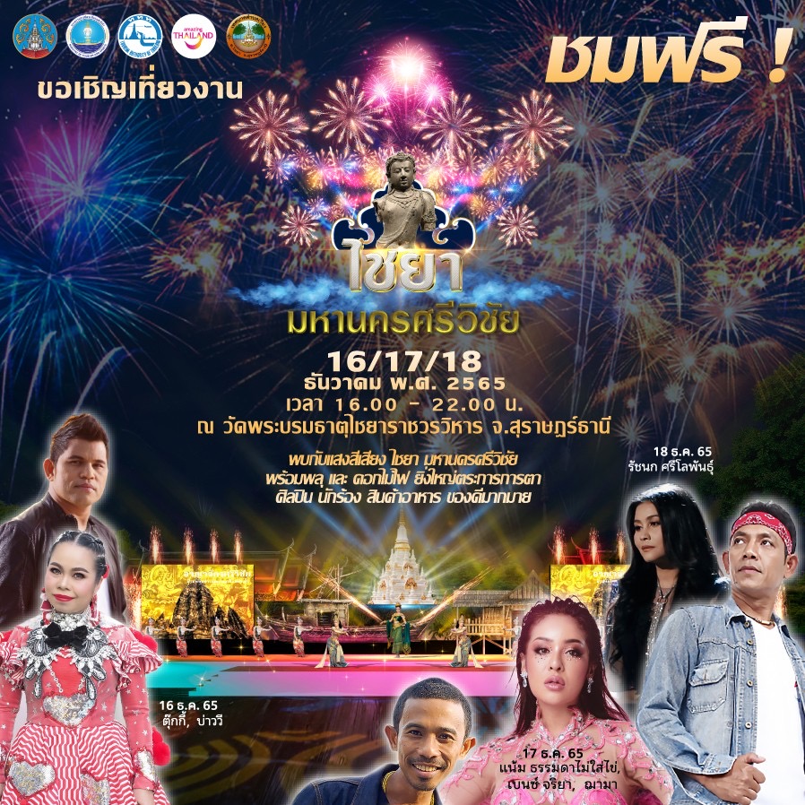 กระทรวงการท่องเที่ยวและกีฬา โดยการท่องเที่ยวแห่งประเทศไทย ร่วมกับหน่วยงานพันธมิตรทั้งภาครัฐและเอกชน อาทิ จังหวัดสุราษฎร์ธานี , เทศบาลตำบลเวียง , วัดพระบรมธาตุไชยาราชวรวิหาร , บริษัท ไอ-อีเวนท์ จำกัด จัดงาน “ไชยา มหานครศรีวิชัย” ณ วัดพระบรมธาตุไชยา ราชวรวิหาร ตำบลเวียง อำเภอไชยา จังหวัดสุราษฎร์ธานี ระหว่างวันที่ 16-18 ธันวาคม 2565 เวลา 16.00-22.00 น. เพื่อสร้างการรับรู้ถึงอัตลักษณ์ทางการท่องเที่ยวในมิติเชิงประวัติศาสตร์วัฒนธรรมของจังหวัดสุราษฎร์ธานี และเป็นการแสดงความพร้อมของภาคประชาชนและภาคการท่องเที่ยวของจังหวัดสุราษฎร์ธานีในการรองรับนักท่องเที่ยว ตอกย้ำภาพลักษณ์เมืองแห่งการท่องเที่ยว กระตุ้นให้เกิดการเดินทางท่องเที่ยวนำไปสู่การสร้างเสริมเศรษฐกิจและกระจายรายได้ให้กับประชาชนในพื้นที่ เพื่อพัฒนาสู่การท่องเที่ยวที่มั่นคงและยั่งยืนต่อไป