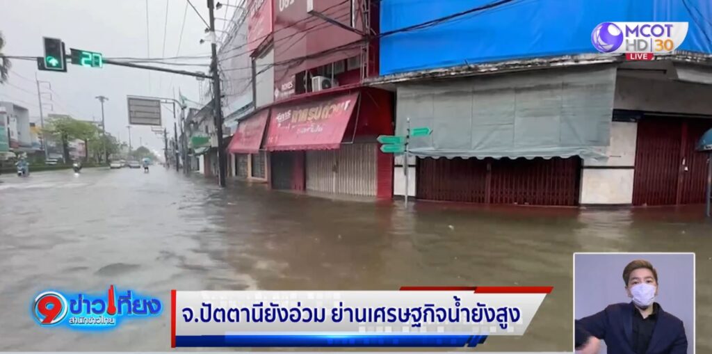 ในพื้นที่หลายจุด จ.ปัตตานี ระดับน้ำเพิ่มสูงขึ้น ถนนทุกสายในเขตเทศบาลจมอยู่ใต้น้ำ ระดับน้ำท่วมสูง 30 ซม. และ 40 ซม. ท่อระบายน้ำไม่สามารถระบายน้ำได้ทัน น้ำได้ทะลักเข้าท่วมบ้านเรือน ร้านค้าของประชาชนที่อาศัยติดกับถนน 2 ร้านค้าต้องปิดร้าน ชาวบ้านต้องนำกระสอบทราบมาวางกั้นไว้บริเวณหน้าบ้าน เพื่อป้องกันความเสียหายเพิ่ม ขณะนี้เจ้าหน้าที่ต้องนำแผงกั้นมาปิดเส้นทางชั่วคราว เนื่องจากรถเล็กสัญจรไม่ได้ หลายคันต้องจอดทิ้งไว้ข้างทาง