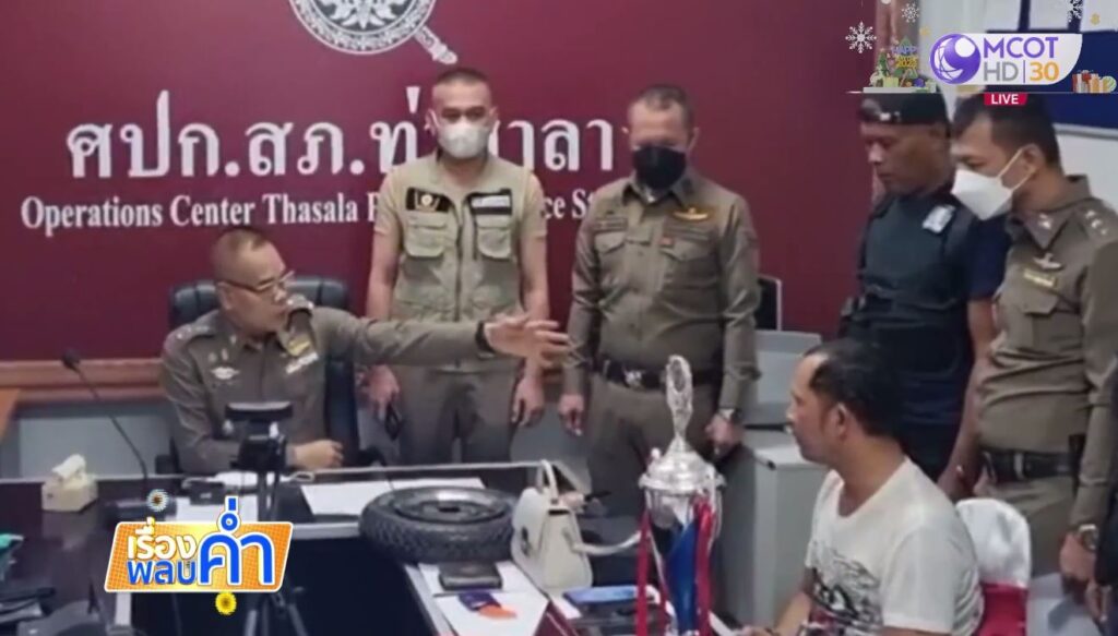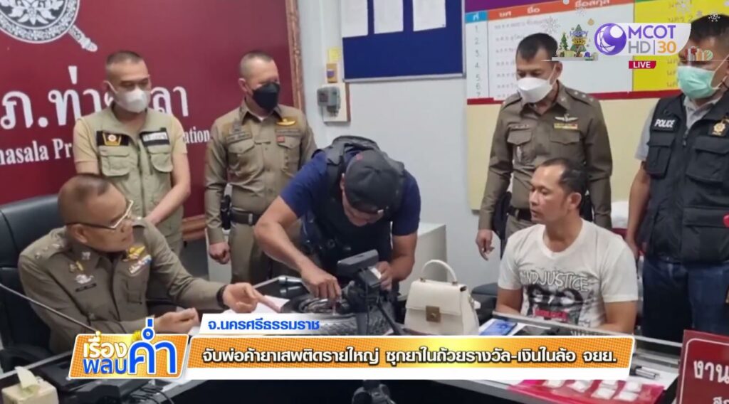 นครศรีธรรมราช 21 ธ.ค. – ตำรวจ สภ.ท่าศาลา จ.นครศรีธรรมราช เข้าจับกุมพ่อค้ายาเสพติดรายใหญ่ พร้อมของกลางยาบ้ากว่า 100 เม็ด ไอซ์ 7 ถุง และมีเงินสดกว่าล้านบาท ที่ซุกไว้ในถ้วยรางวัลและล้อรถ จยย.