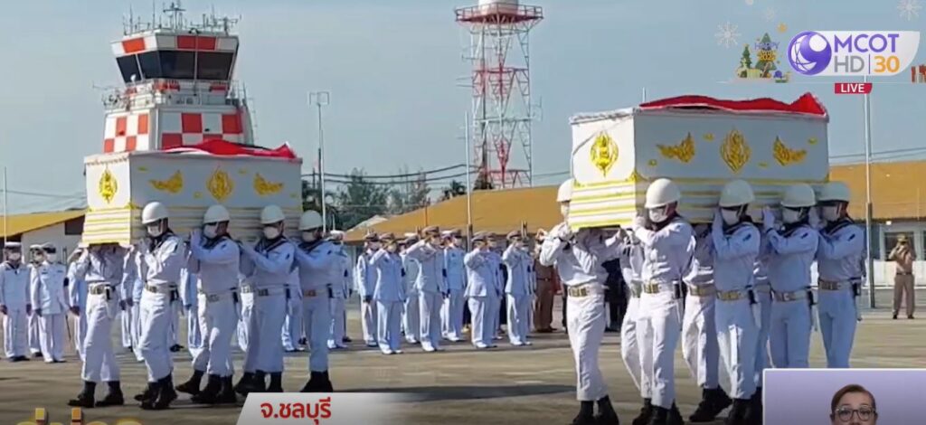 ชลบุรี 24 ธ.ค. – กองทัพเรือเคลื่อนร่างจ่าเอกจักรพงศ์ พูลผล และพลทหารอัครเดช โพธิ์บัติ กำลังพลเรือหลวงสุโขทัย กลับบ้านเกิด จ.สุราษฎร์ธานี พิธีเป็นไปอย่างสมเกียรติ