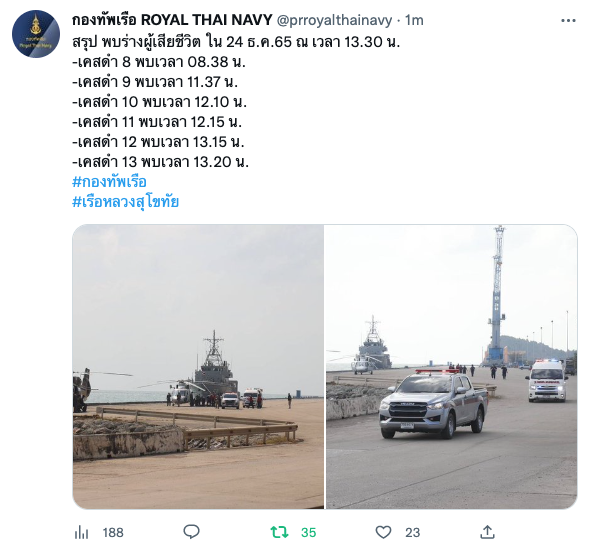 ขณะที่ล่าสุดเมื่อเวลา 13.42 น. ทวิตเตอร์กองทัพเรือแจ้งพบร่างผู้เสียชีวิตเพิ่มอีก 2 ราย เคสดำที่ 12 และ 13 เวลา 13.15 น. อากาศยาน พบผู้เสียชีวิต 1 นาย (เคสดำ 12) โดย เรือหลวงตากสิน กำลังเข้าเก็บกู้ เวลา 13.20 น. เรือหลวงกระบุรี พบผู้เสียชีวิต 1 นาย (เคสดำ 13) กำลังเข้าเก็บกู้