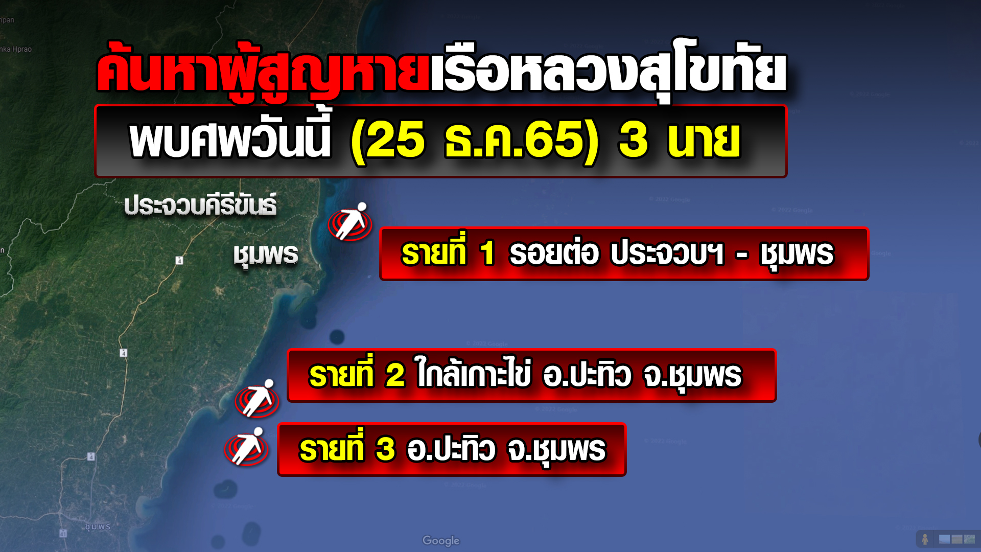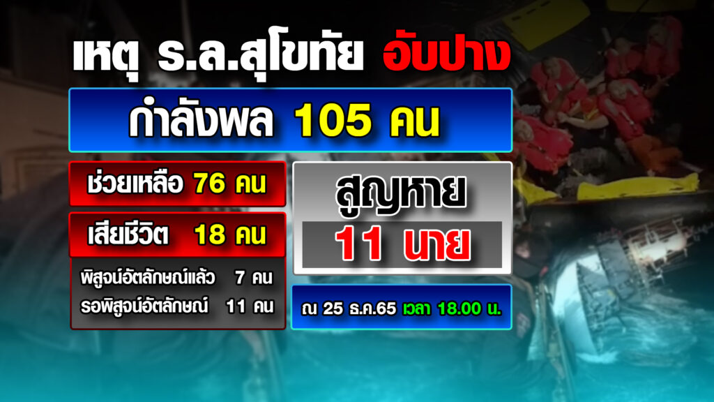 วันนี้ (25 ธ.ค.65) พบกำลังพลที่เสียชีวิตจากเรือหลวงสุโขทัยอัปปาง อีก 3 ราย โดยรายแรกพบเมื่อเวลา 14.20 น. ผู้เสียชีวิตลอยอยู่ในทะเลพื้นที่ค้นหา เอ5 ใกล้ชายฝั่ง เป็นช่วงรอยต่อ จ.ประจวบฯ – ชุมพร ตรวจสอบเบื้องต้นพบหลักฐานบ่งชี้ว่าเป็นกำลังพลของกองทัพเรือ นับเป็นผู้เสียชีวิตรายที่ 16