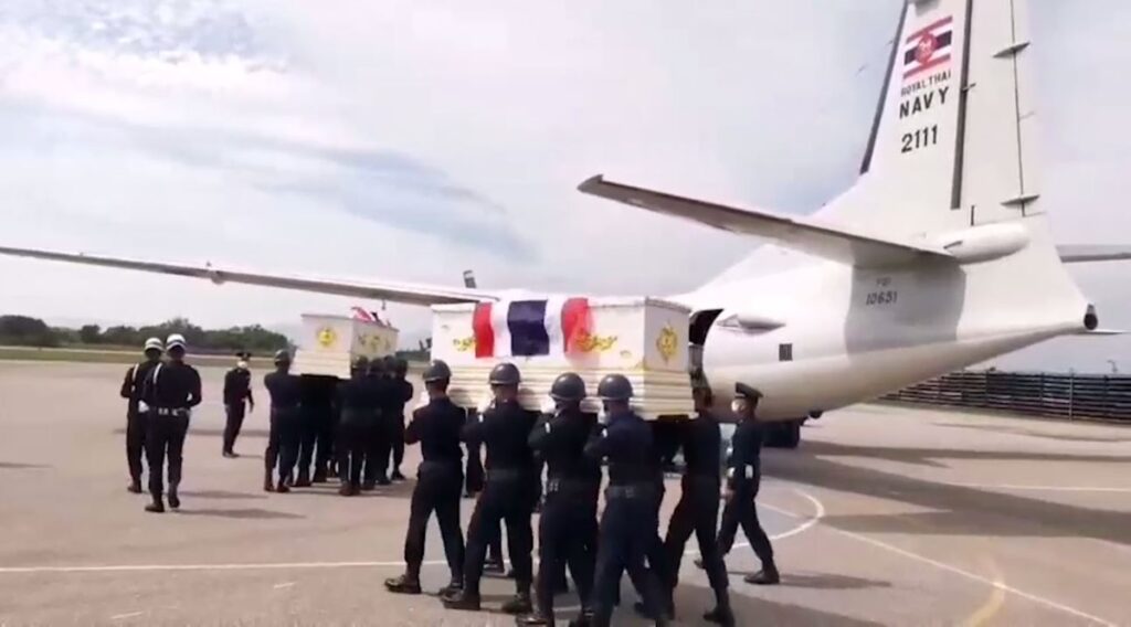 โดยเมื่อช่วงบ่ายวันนี้ ร่างของกำลังพลทั้ง 3 นาย ถูกลำเลียงไปยังท่าอากาศยานกองบิน 5 ประจวบคีรีขันธ์ เพื่อกลับสัตหีบ โดยเครื่องบินลำเลียง Fokker ของกองทัพเรือ ซึ่งทางกองทัพอากาศได้จัดแถวกองทหารเกียรติยศส่งร่างกำลังพลอย่างสมเกียรติ เครื่องบินลำนี้เดินทางไปรับร่างกำลังพลอีก 1 นาย คือ พลทหาร วรพงษ์ บุญละคร ที่กองบิน 6 ดอนเมือง เพื่อนำร่างทั้ง 4 นาย เดินทางไปสนามบินอู่ตะเภา ก่อนเคลื่อนไปยังฌาปนสถานกองทัพเรือ สัตหีบ เพื่อประกอบพิธีอย่างสมเกียรติ