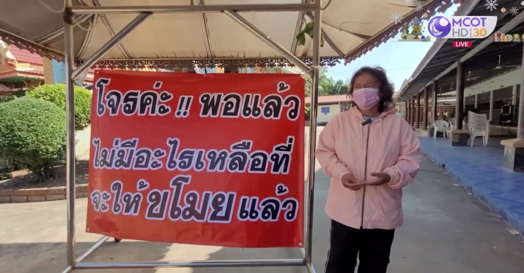 ที่วัดมะขามเตี้ย อ.เมือง จ.พิษณุโลก วัดมะขามเตี้ยขึ้นป้ายประชดโจรขึ้นที่บริเวณหน้าเมรุ ภายในวัด ข้อความว่า “โจรค่ะ พอแล้ว ไม่มีอะไรเหลือที่จะขโมยแล้ว” นางสายใจ ตรงต่อกิจ คนดูแลวัด ที่ขึ้นป้ายดังกล่าวเล่าว่า ดูแลวัดมาหลายปี ที่ผ่านมา มีขโมย ชอบมาลักสิ่งของเครื่องใช้ภายในวัด เป็นประจำ ล่าสุดแอบตัดสายไฟในห้องน้ำ ทำให้ภายในวัดมืด และเข้ามาขโมยได้ง่ายขึ้น บางครั้งก็มาลักถ้วยชาม อุปกรณ์ทำครัวจนแทบไม่เหลือ เวลาวัดจัดงาน ต้องซื้อมาใหม่ประจำ ทำให้ตนทนไม่ไหว สั่งทำป้ายประชดโจร ข้อความว่า “โจรค่ะ พอแล้ว ไม่มีอะไรเหลือที่จะขโมยแล้ว” เอาไว้ด้านหน้าเมรุ ให้โจรที่จะมาลักทรัพย์ภายในวัด ให้เห็นกันไปเลย