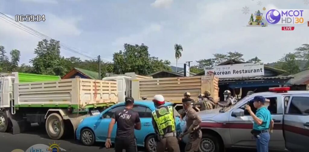 เจ้าหน้าที่ตำรวจ สภ.เกาะช้าง จ.ตราด ต้องใช้รถบรรทุก 6 ล้อ จอดขวางถนนบริเวณชุมชนบ้านคลองพร้าว หมู่ 4 ต.เกาะช้าง เพื่อสกัดรถเก๋งสีฟ้า ที่มีชายอายุ 38 ปี เป็นคนขับขี่ และใช้รถยนต์สายตรวจประกบอยู่ด้านหลัง