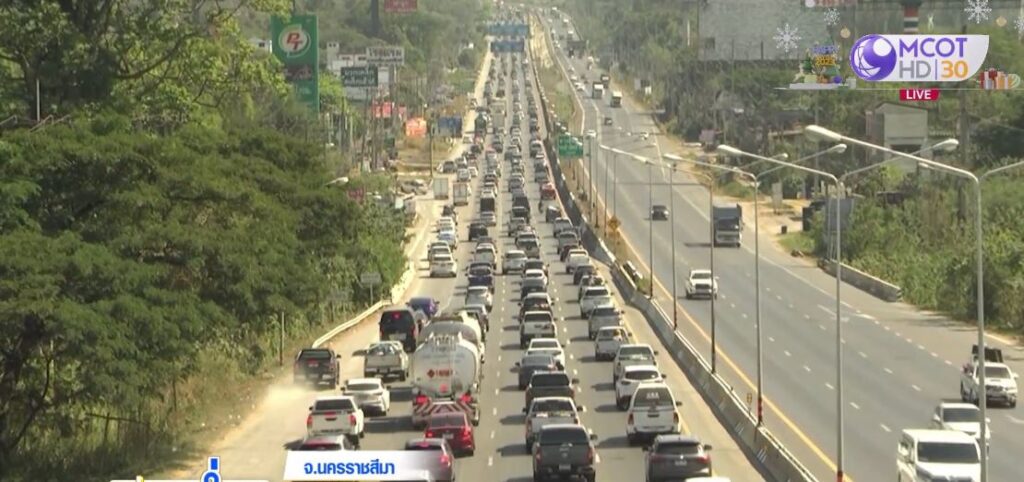 นครราชสีมา 28 ธ.ค. – ประชาชนเริ่มทยอยออกต่างจังหวัด ถนนมิตรภาพแน่น รถเต็มทุกช่องทาง ชะลอตัวช่วงขึ้นเนินเขา ส่วนทางเข้ามอเตอร์เวย์ (M6) กม. 65 หน้าศูนย์พักพิงสุนัขจรจัด ต.หนองสาหร่าย อ.ปากช่อง จ.นครราชสีมา จะเปิดให้ใช้เส้นทางฟรี ตั้งแต่วันพรุ่งนี้ ถึง 31 ธ.ค. เวลา 06.00-24.00 น. แต่วันนี้มีคนหลงเข้าไป กลับรถออกมาเข้าถนนมิตรภาพตามเดิม คาดค่ำนี้การจราจรจะหนาแน่นมากขึ้น