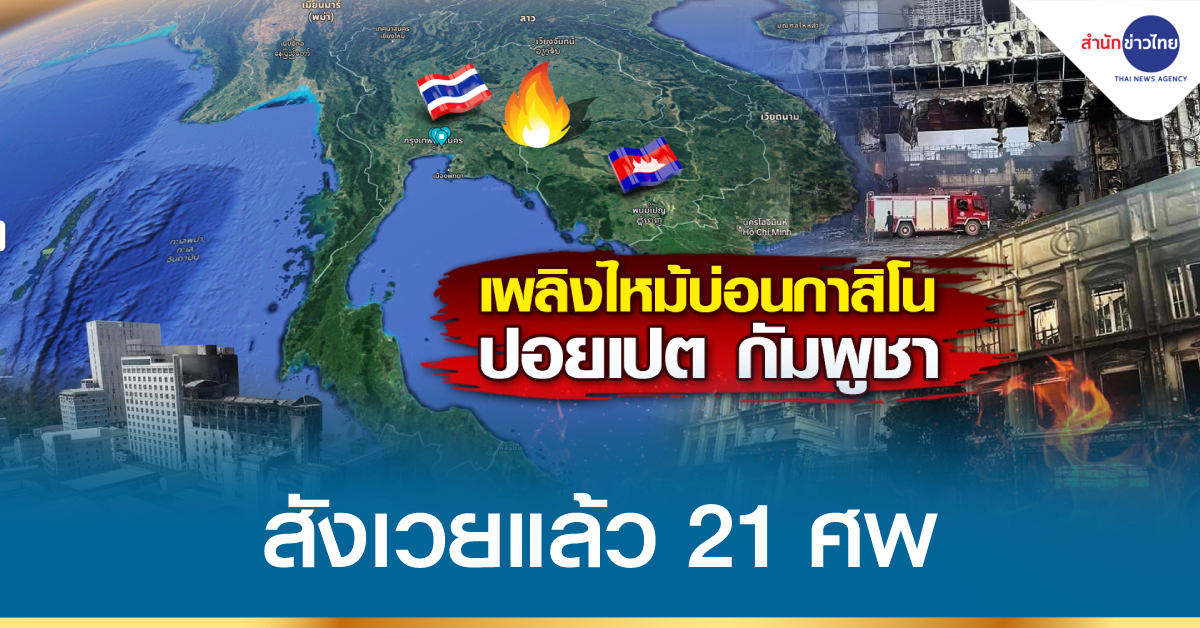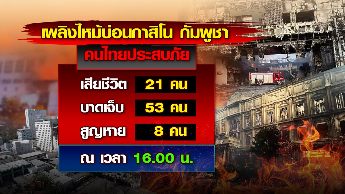 ที่ศูนย์ประสานงานช่วยเหลือคนไทยผู้ประสบเหตุเพลิงไหม้ปอยเปต กัมพูชา รายงานว่า ขณะนี้ (29 ธ.ค.65 ณ เวลา 16.00 น.) พบผู้เสียชีวิตซึ่งเป็นคนไทยในเหตุเพลิงไหม้บ่อนกาสิโนฝั่งกัมพูชาแล้ว จำนวน 21 ราย บาดเจ็บ 53 ราย สูญหาย 8 ราย
